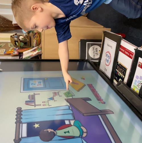 The nursery children have been developing their oral blending skills. The children listened very carefully as an adult sounded out simple words (for example, c-a-t or d-o-g). Their challenge was to blend the sounds together in their heads and then choose the correct object to help them “cross the river.”