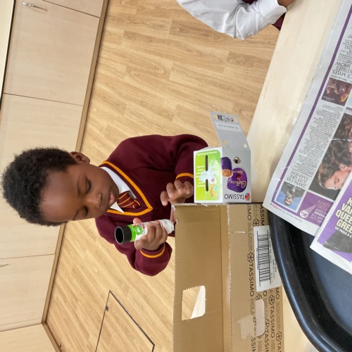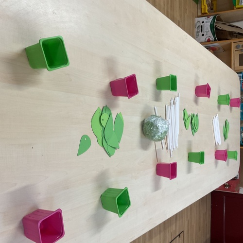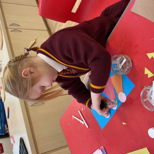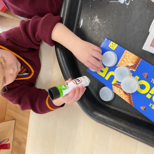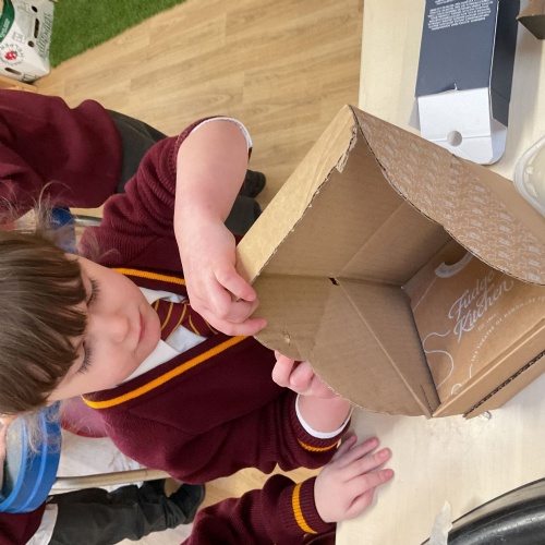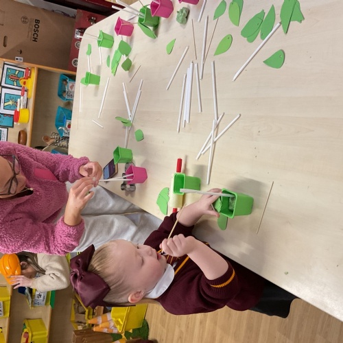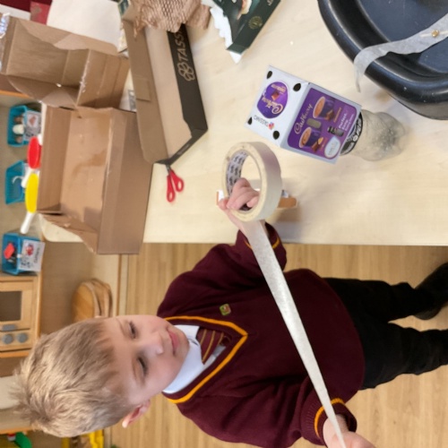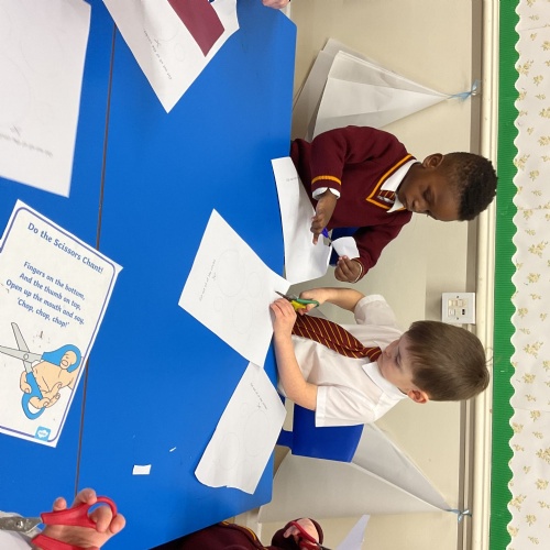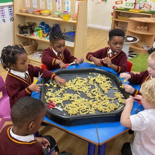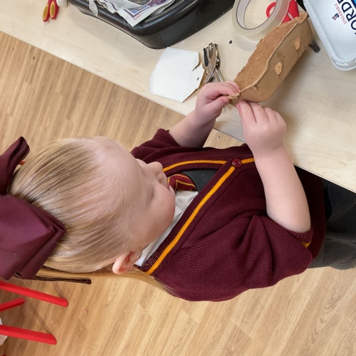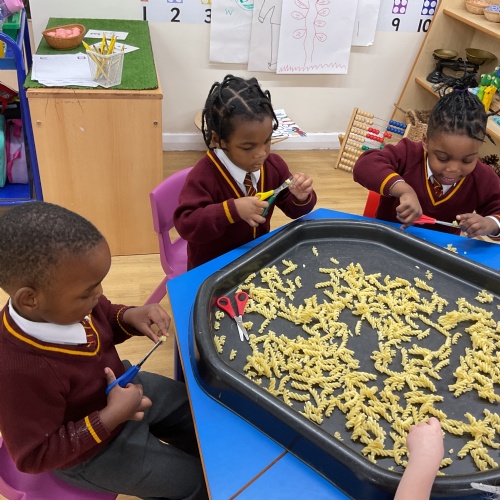 The nursery children have been busy exploring the junk modelling area, learning different ways to join materials together. They have also been practising cutting a variety of materials and particularly enjoyed cutting pasta. Through these activities, the children have been learning how to safely hold and use scissors, building their confidence and fine motor skills.