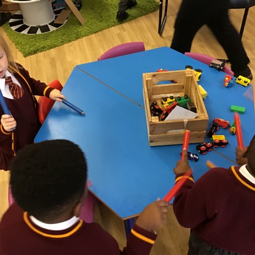 The nursery children enjoyed a 'drumming walk' as part of their Phase 1 Phonics. The children enjoyed using the claves to drum quietly, loudly, quickly and slowly. They enjoyed exploring the different noises the surfaces made as they drummed on them.