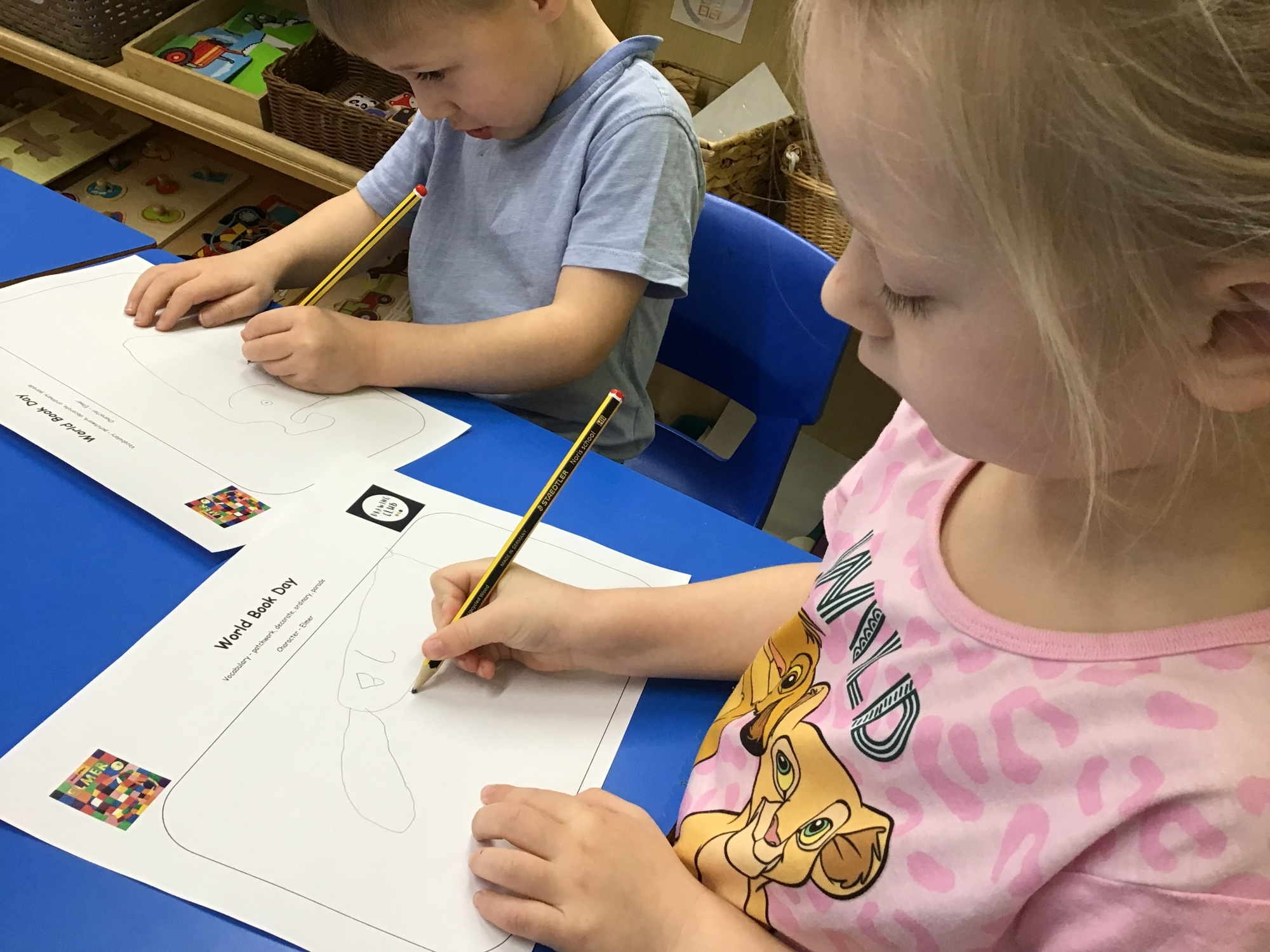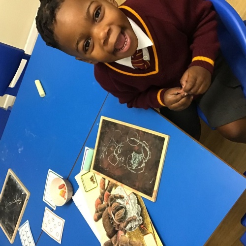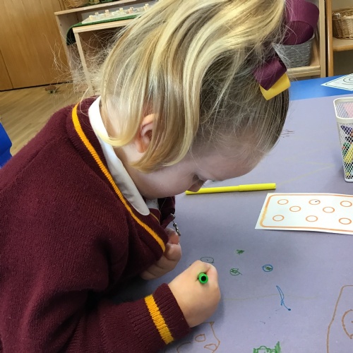 The nursery children have been exploring mark making with different drawing materials. They have used crayons, felt tips and chalk to draw patterns and pictures.