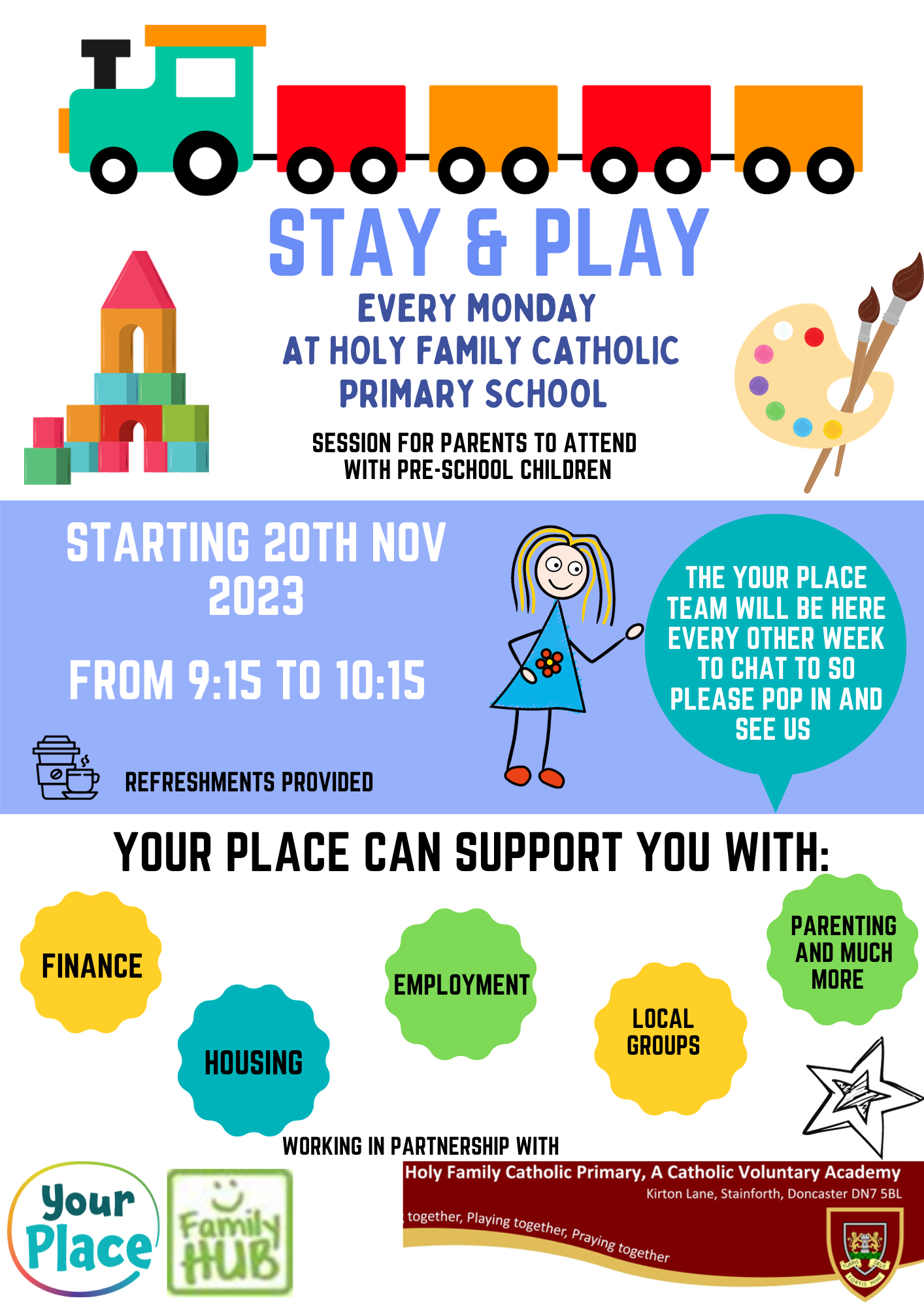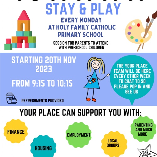Stay and Play is a free stay & play preschool session for parent/carers to fetch their child/grandchild along and meet other parents. Light refreshments are included. Every Monday morning 9:15 – 10:15am.