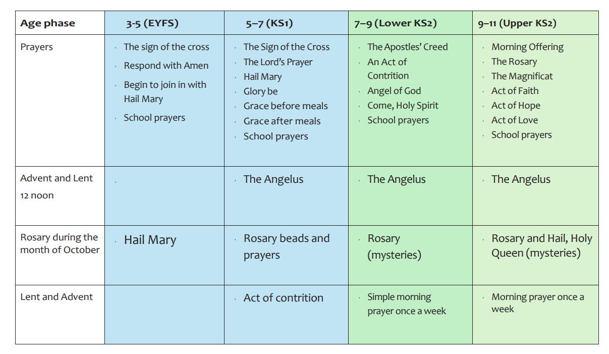 Below shows the prayer structure at Holy Family, outlining our four daily prayer moments, the seasonal focus during the liturgical year, and the progression of prayer across each key stage.