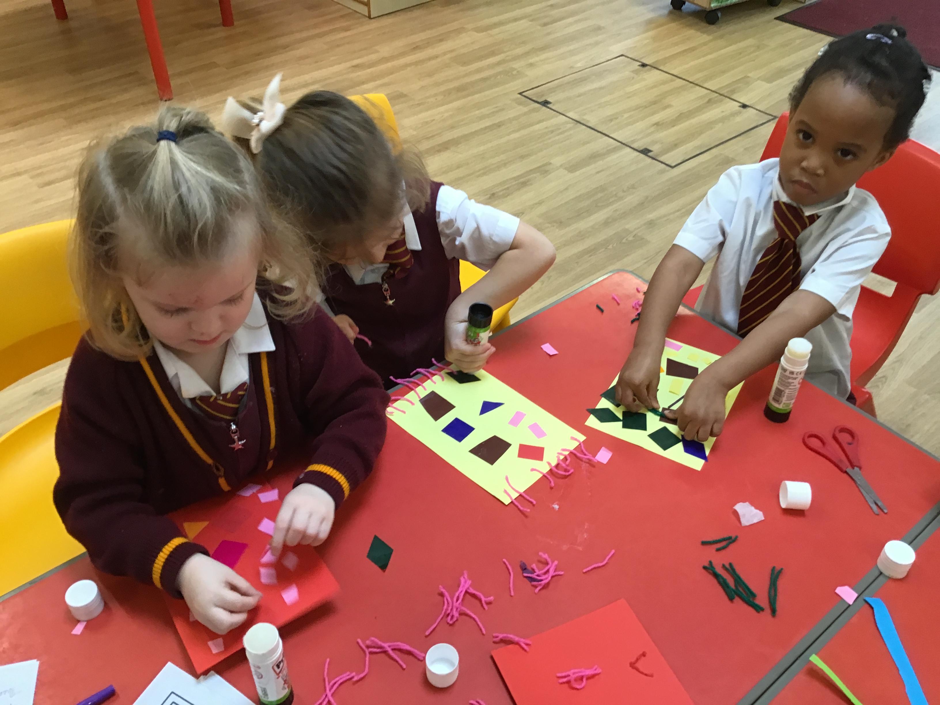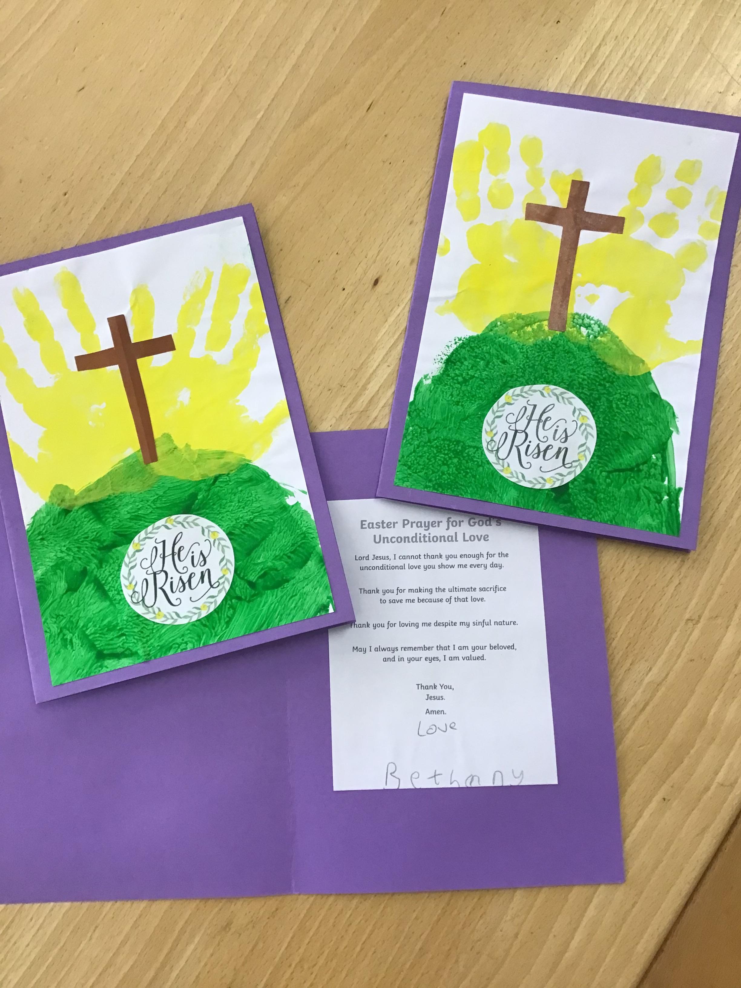 The children used shaving foam, paint and a window squeegee to make marbled crosses for their Easter cards. They made Easter cards to celebrate hope and new beginnings.