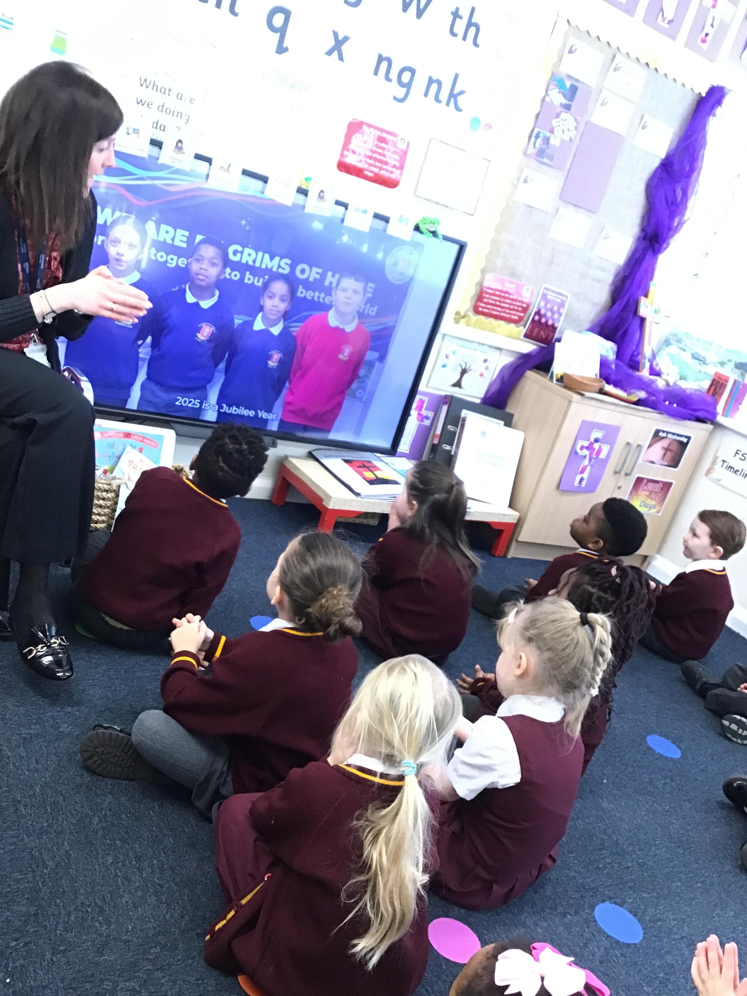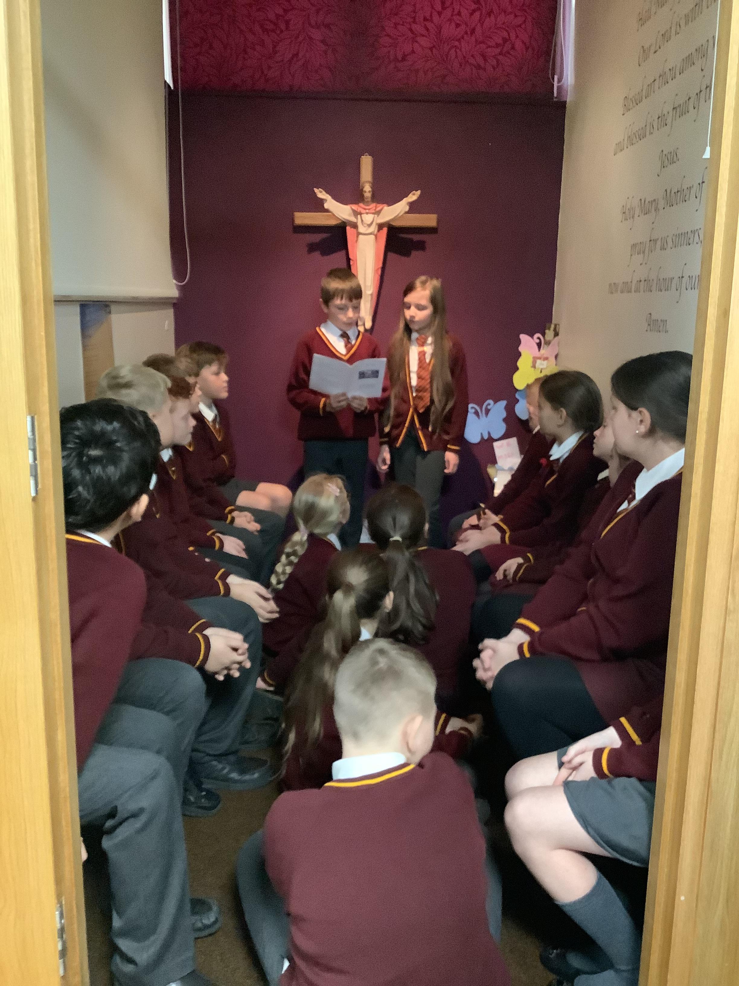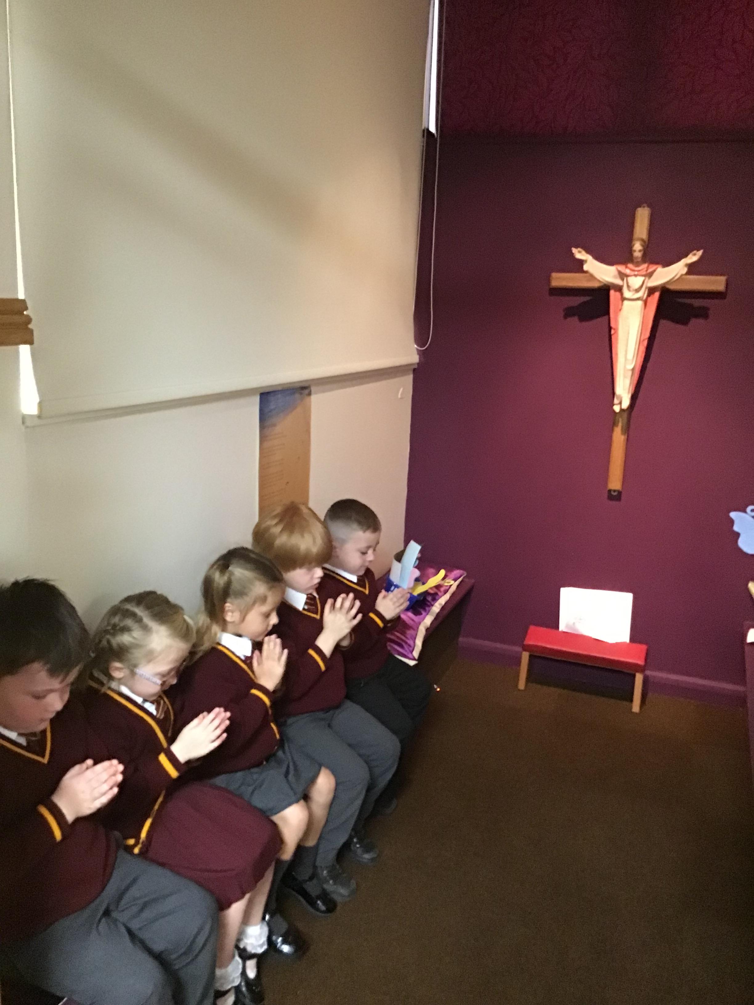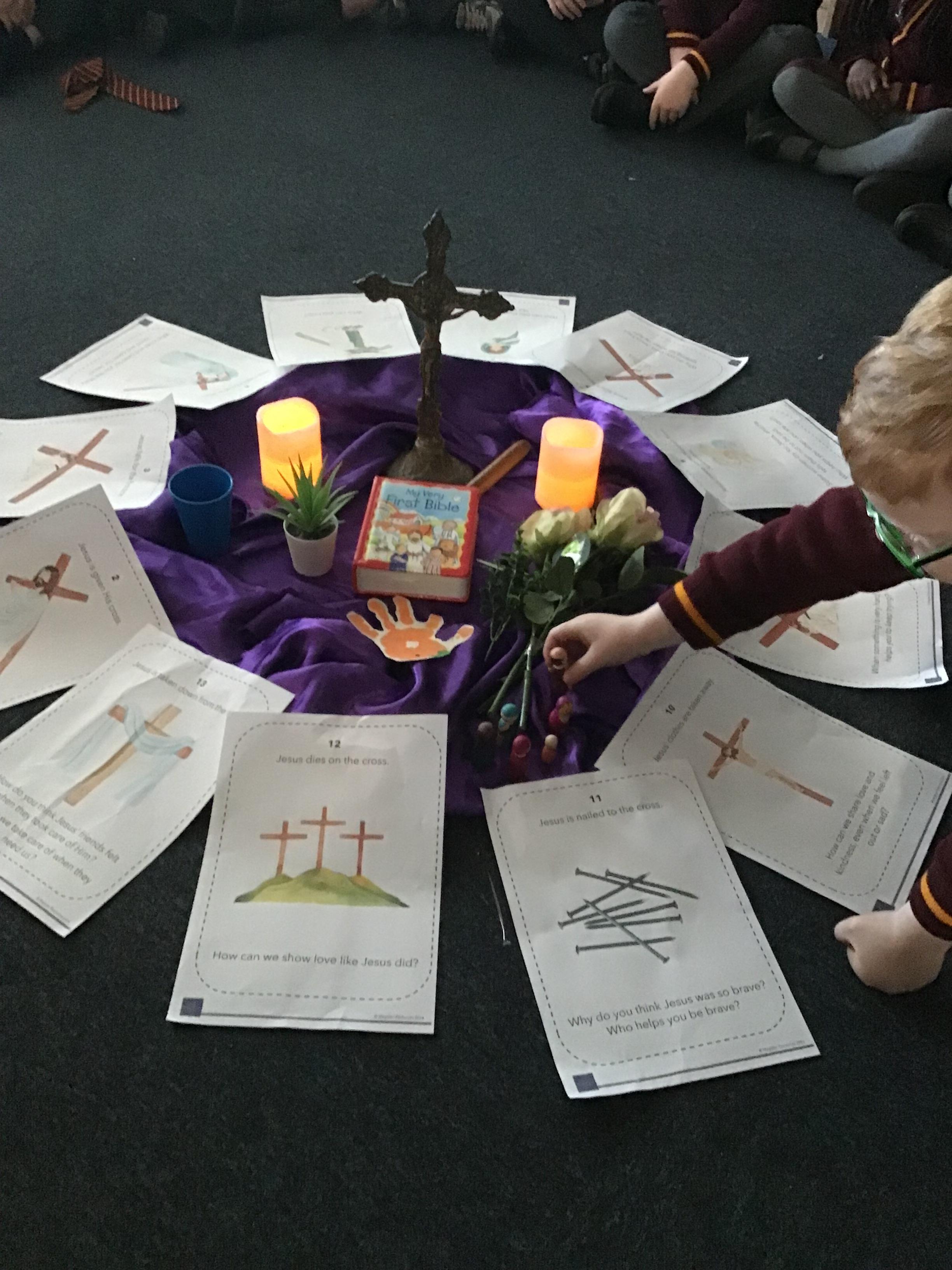 Children in Reception took part in Celebration of the Word using the Stations of the Cross to help them reflect on Jesus' journey to the cross and understand the meaning of His sacrifice.