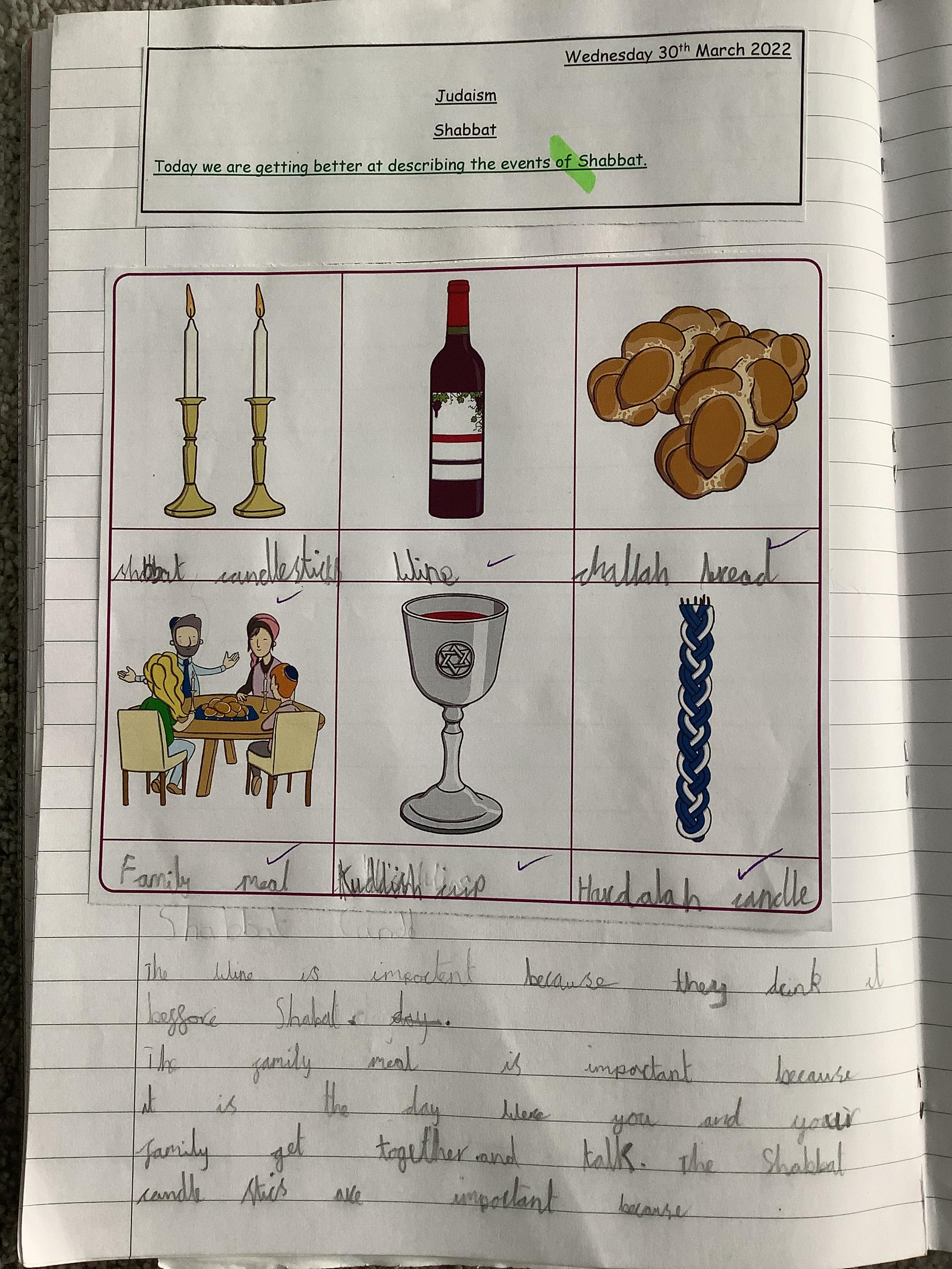 In Year 2, we have studied Judaism. We have studied the Jewish celebration - Shabbat. We watched a video showing how families celebrate Shabbat and why it's important to their faith. We then labelled and wrote about special items that are used during Shabbat.
