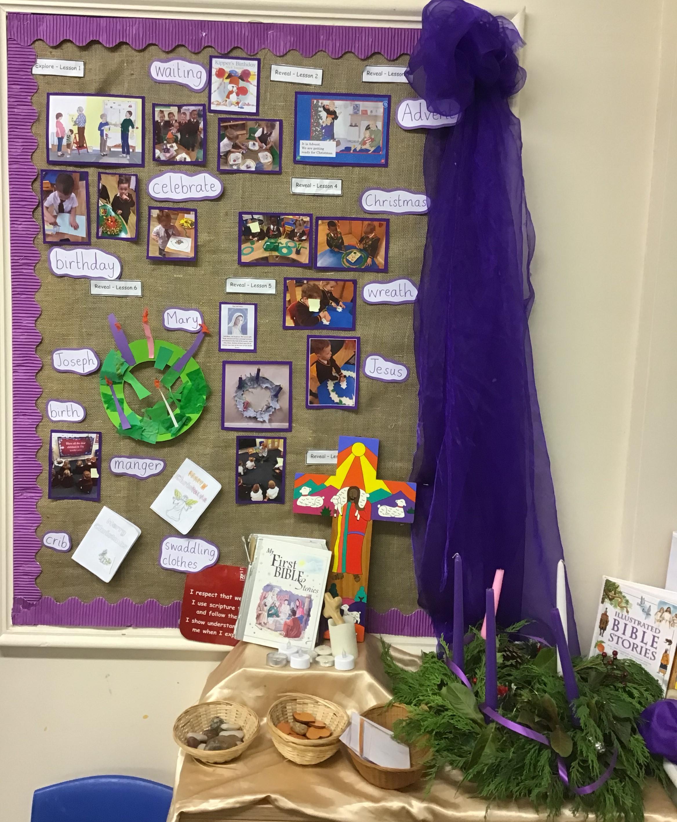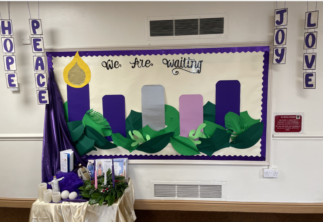 Our beautiful Advent display was made by the children in year 3 and year 5. Using a mixture of both printing techniques and oil pastel drawings, the children form both classes created images of the Advent candles to signify the special time of year.