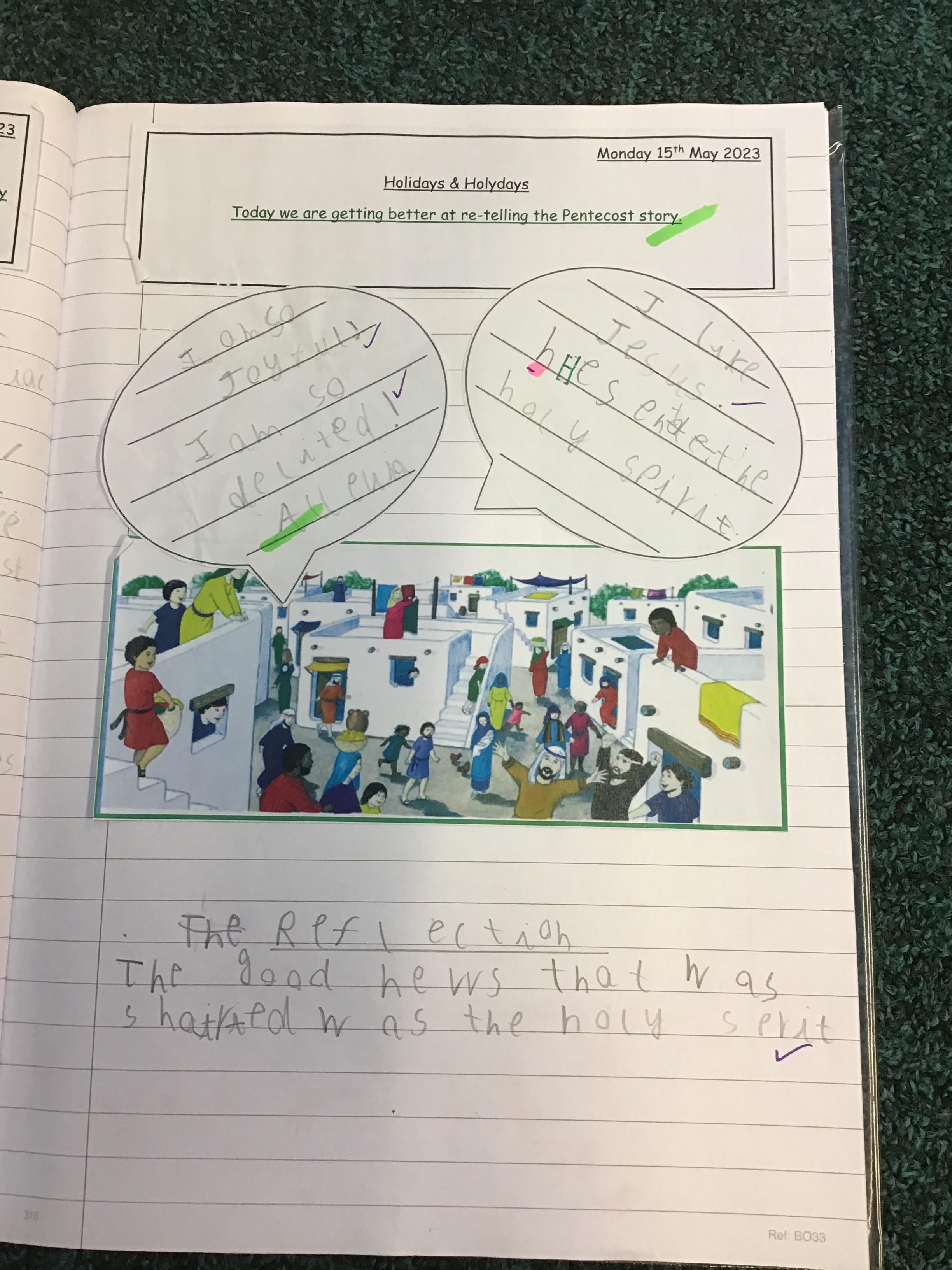 In Year 4, we have been looking at the topic New Life. In today's lesson the children learnt about what Pentecost is. The children answered questions about Peter's message and the coming of the Holy Spirit. The children then looked at the painting 'Pentecost by Titian' and described what they could see.