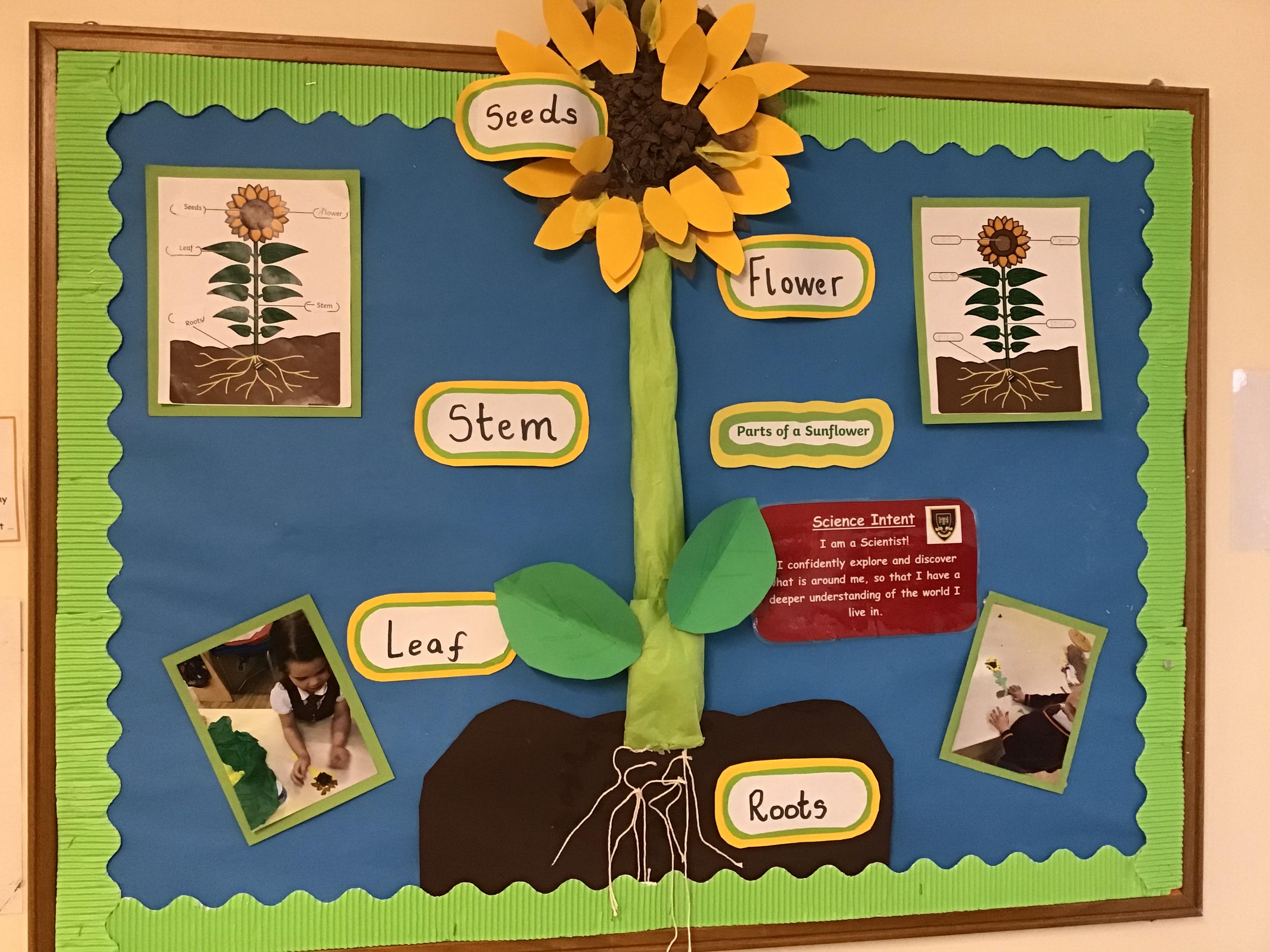Reception children have been busy exploring the natural world around them, learning all about plants. They have named and described some plants, their favourite being the sunflower. Lots of discussions were made to find out how plants grow. New vocabulary was introduced and children began to use this when labelling parts of a plant. They used their creative skills too to make a sunflower, using different media and colour for a purpose.