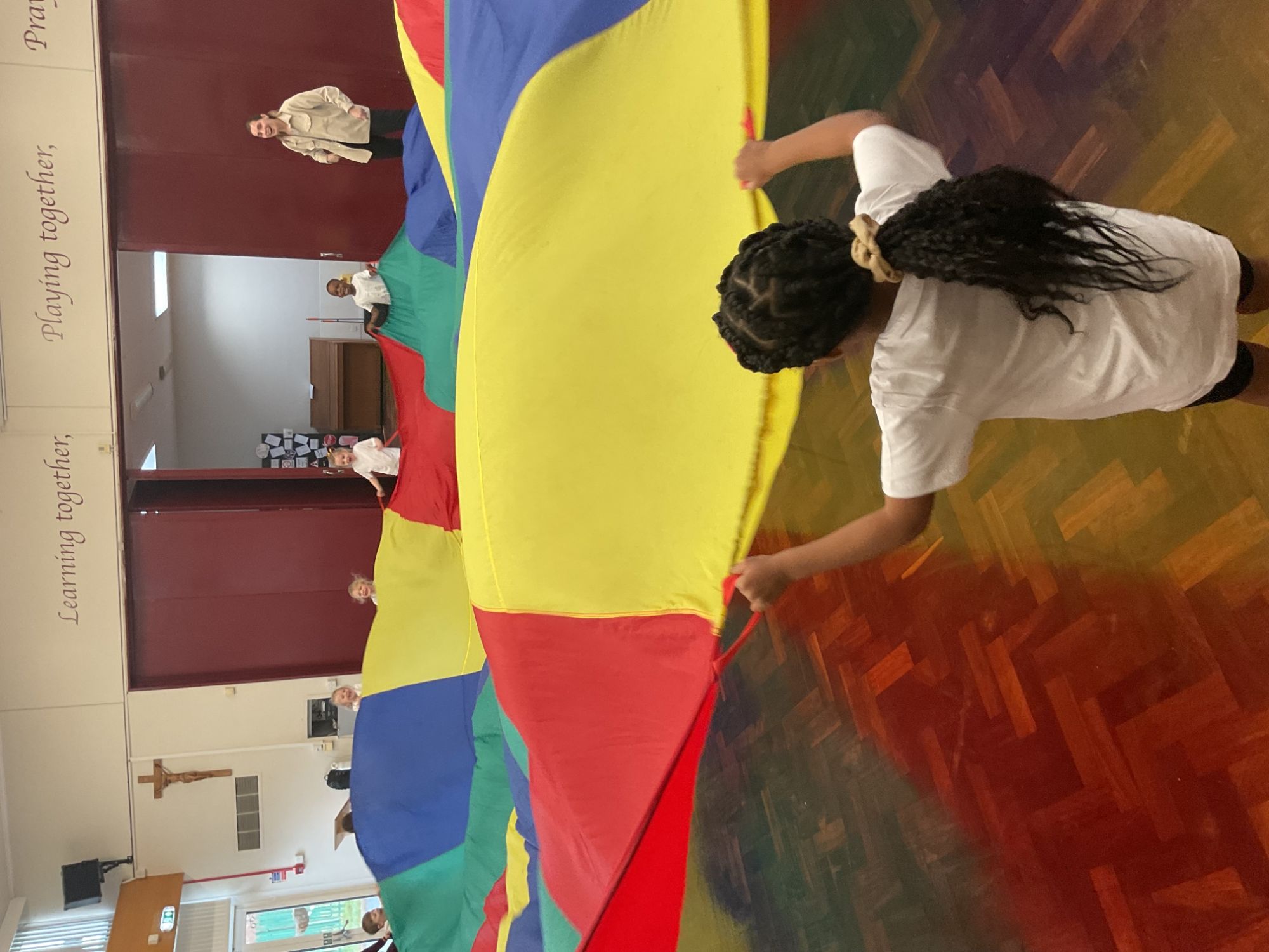 Reception children developed their gross motor skills in PE by working together to lift, shake and move a large parachute, building strength, coordination and teamwork.