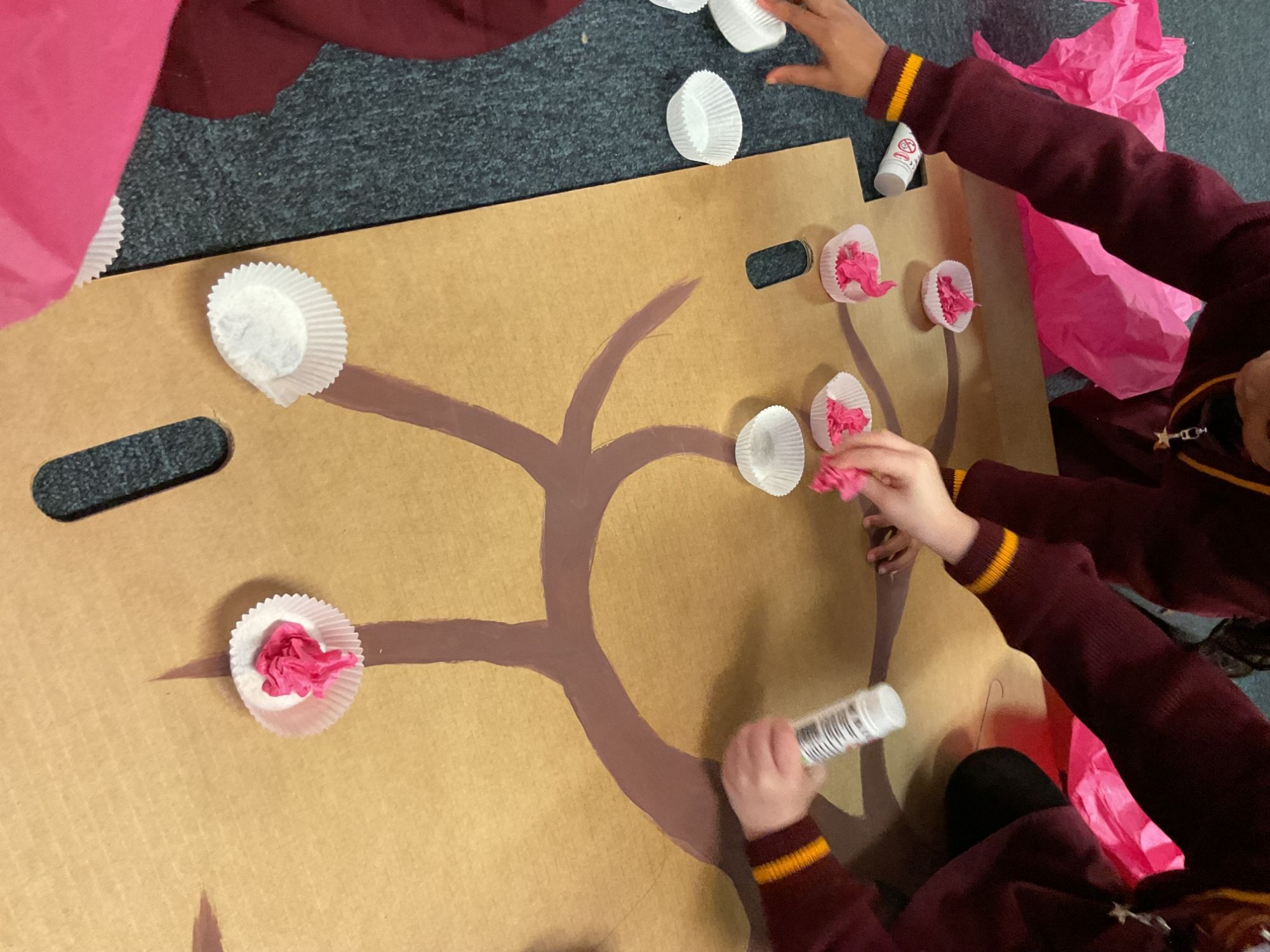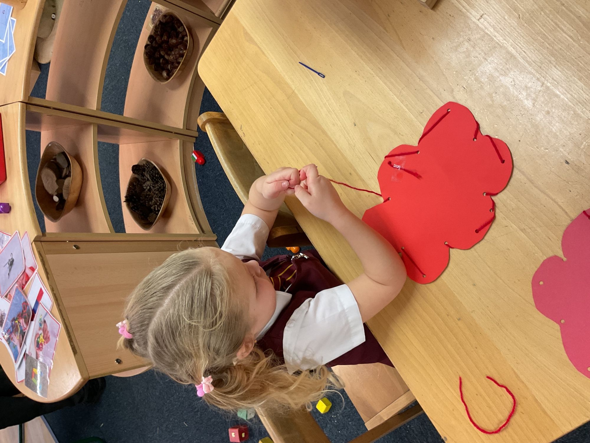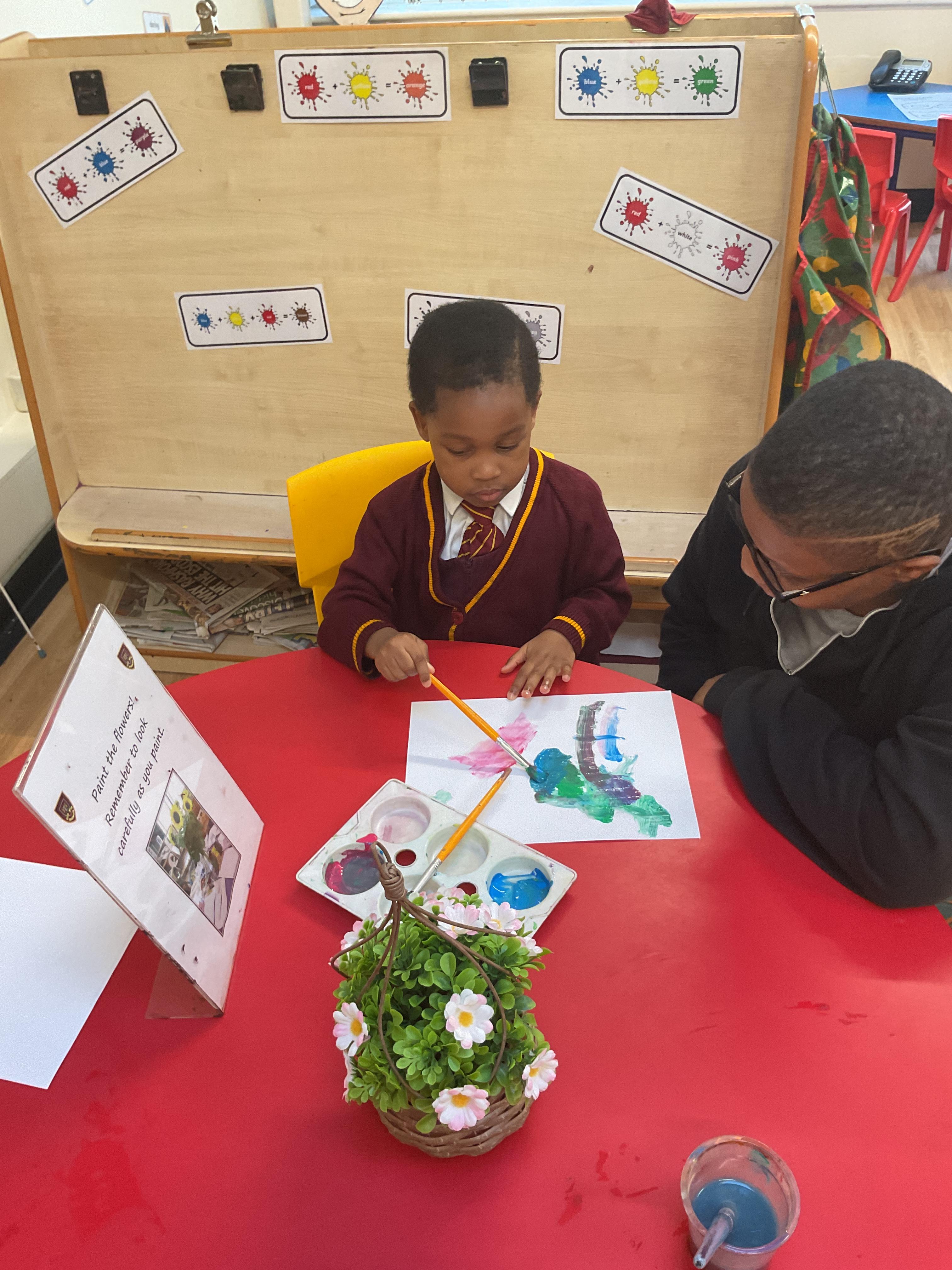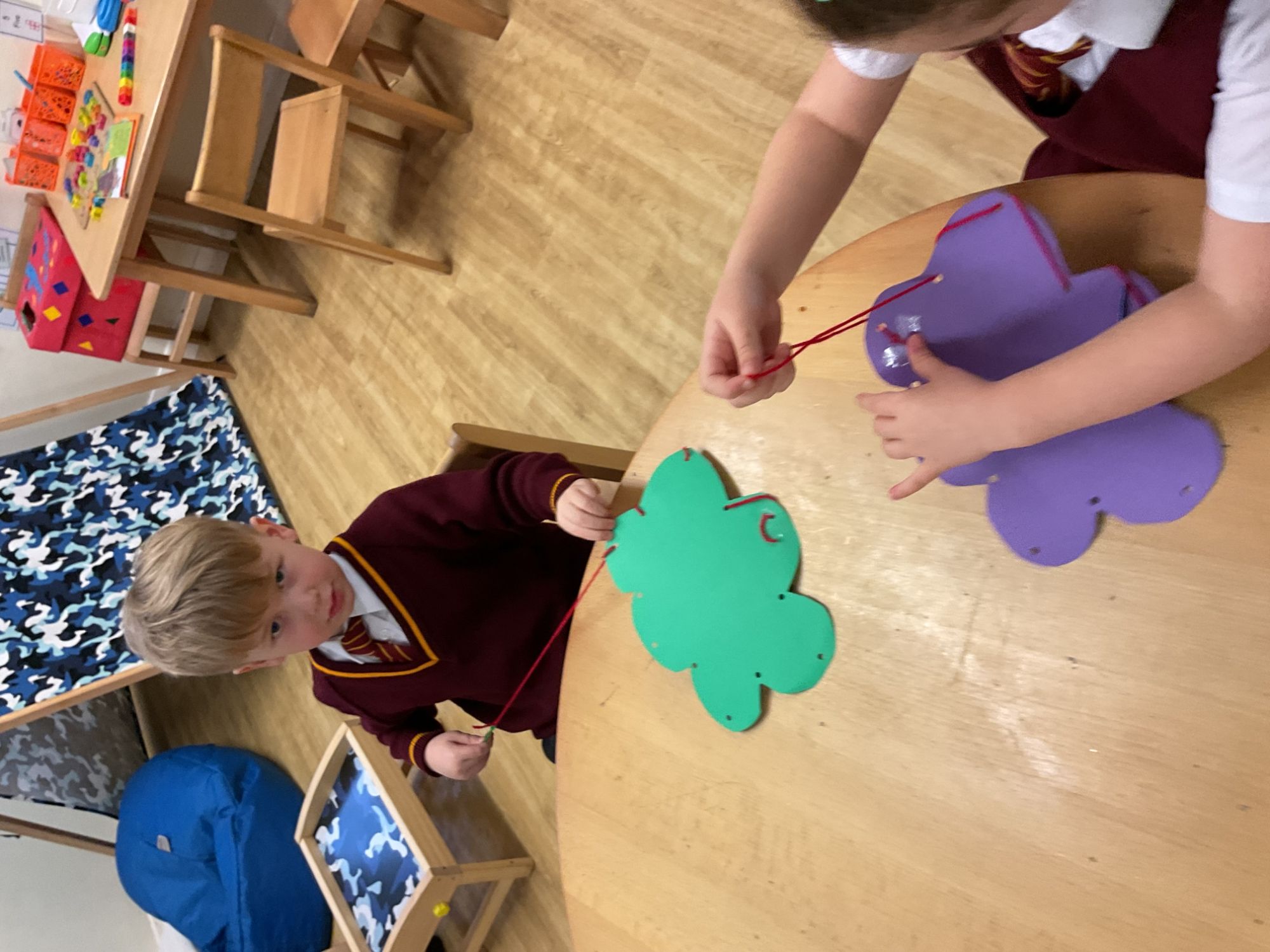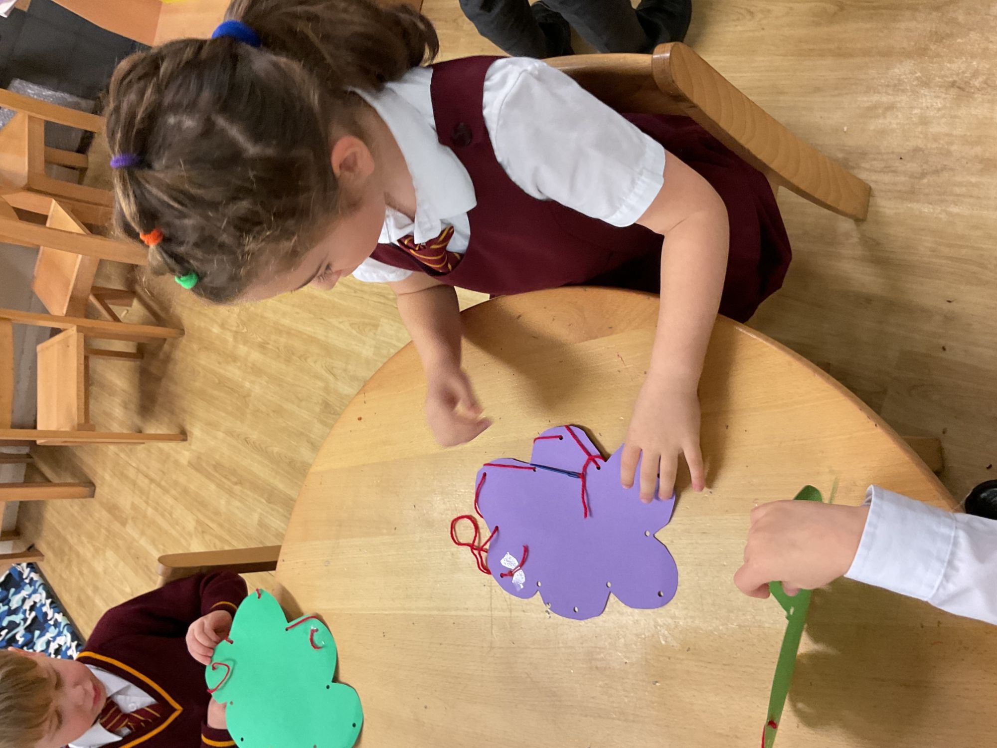 Children used a range of tools and techniques to create their own flower threading pattern. This helped to develop their fine motor skills and explore a variety of materials and to share their creations.