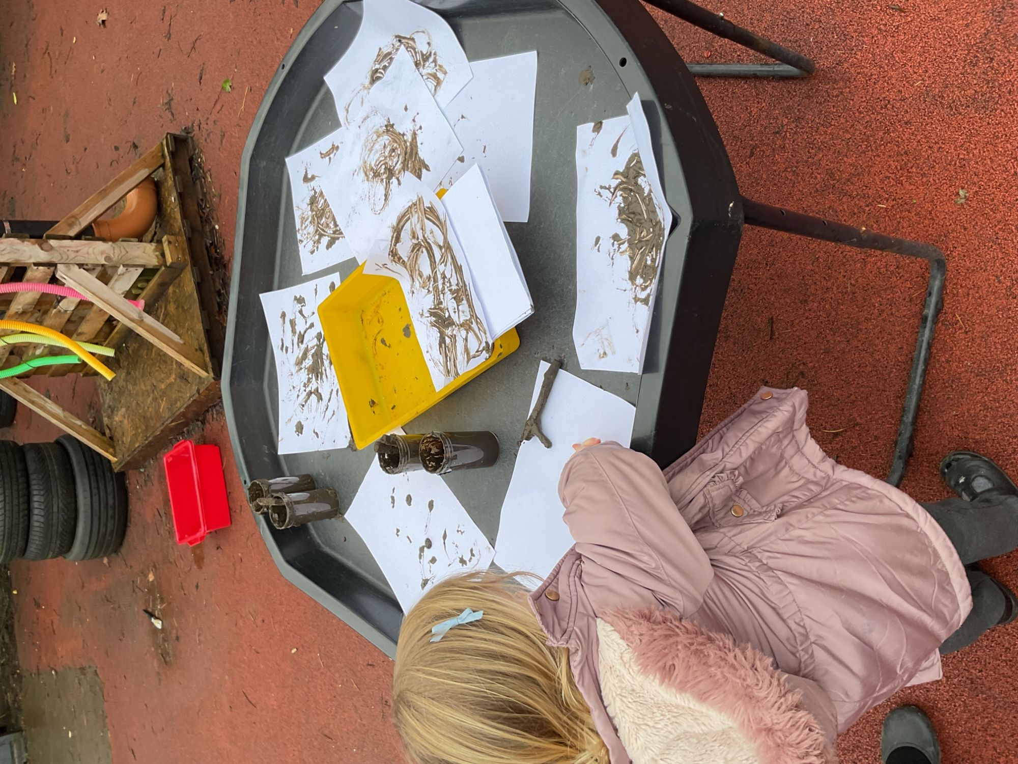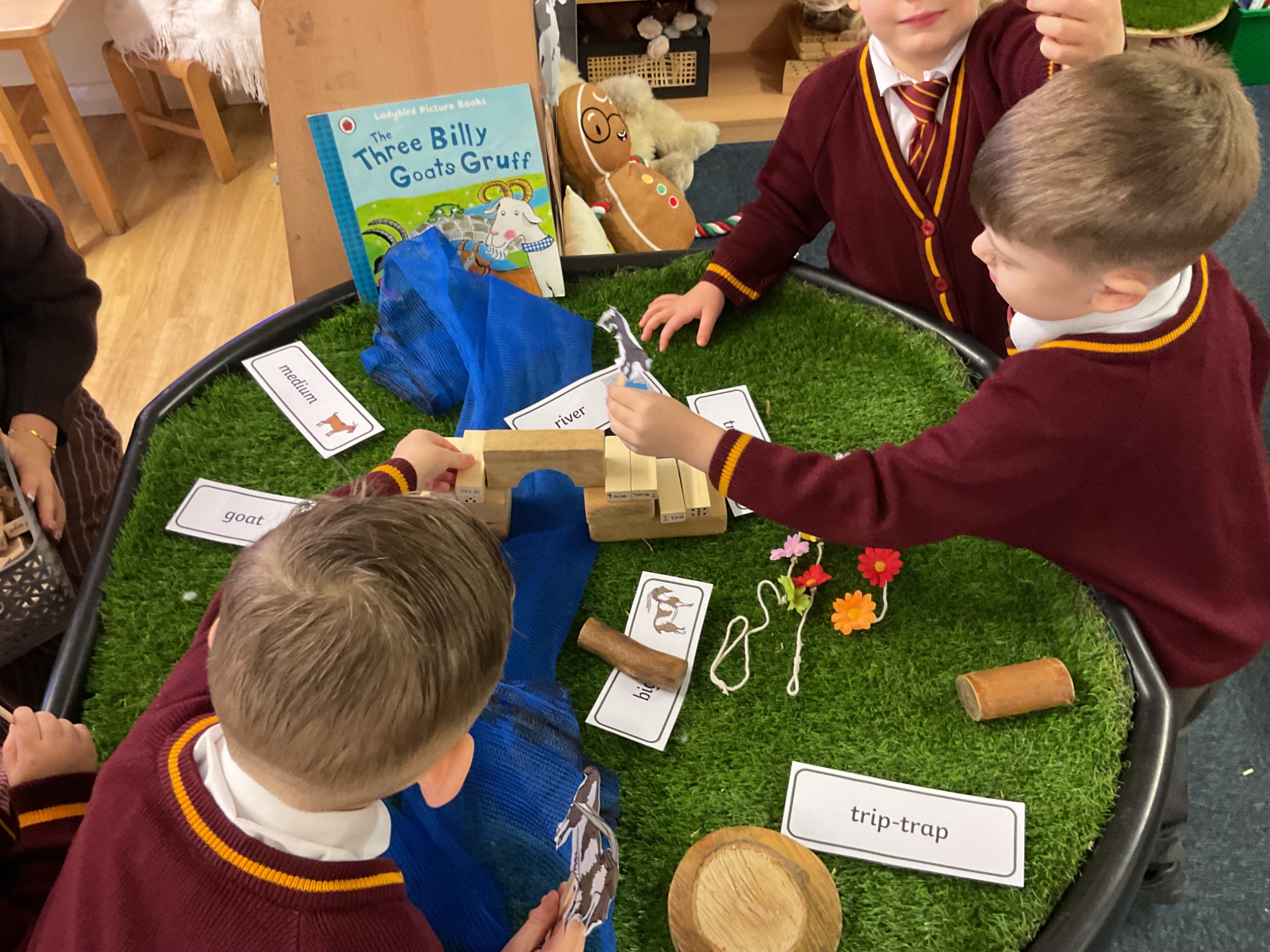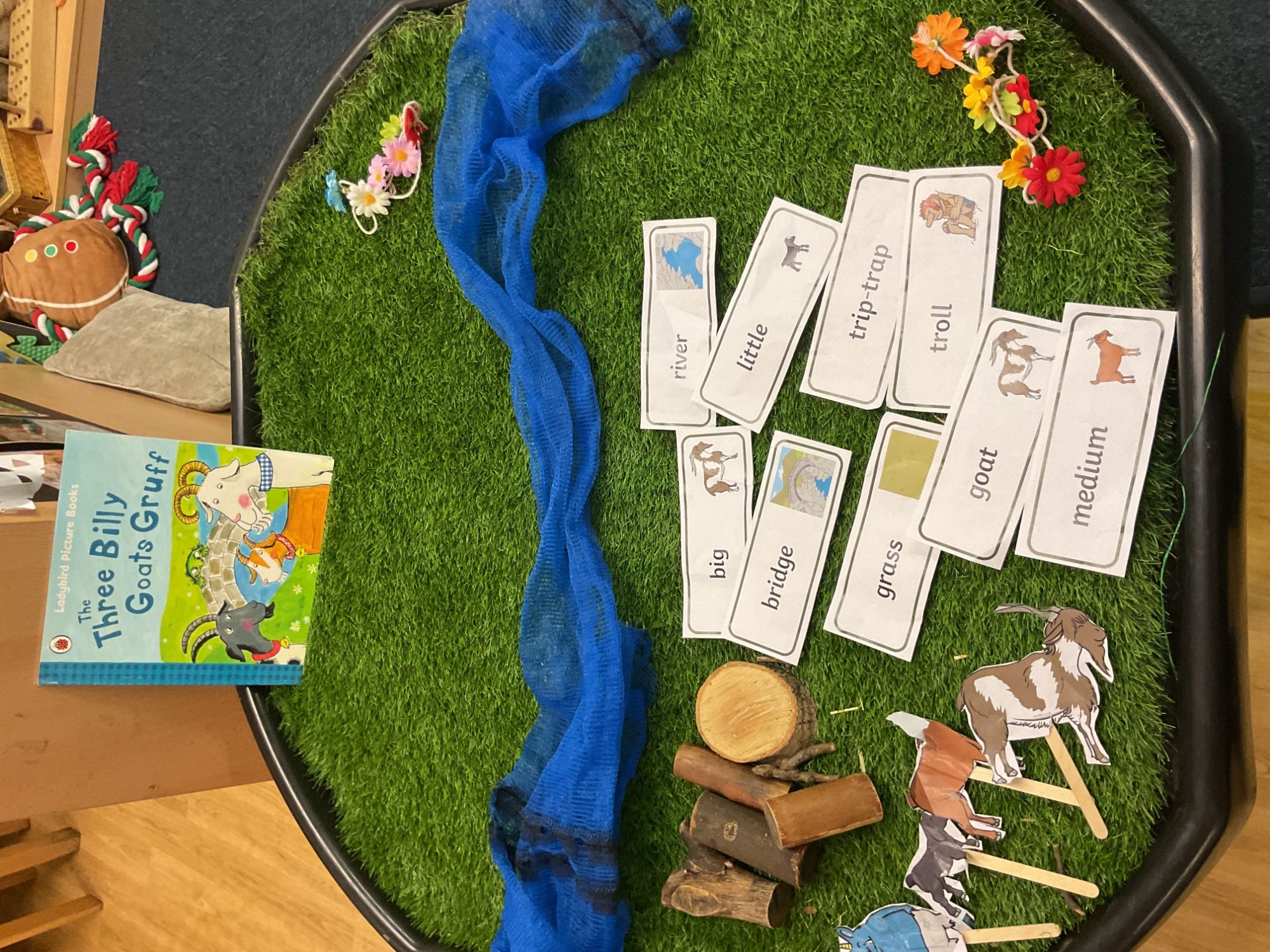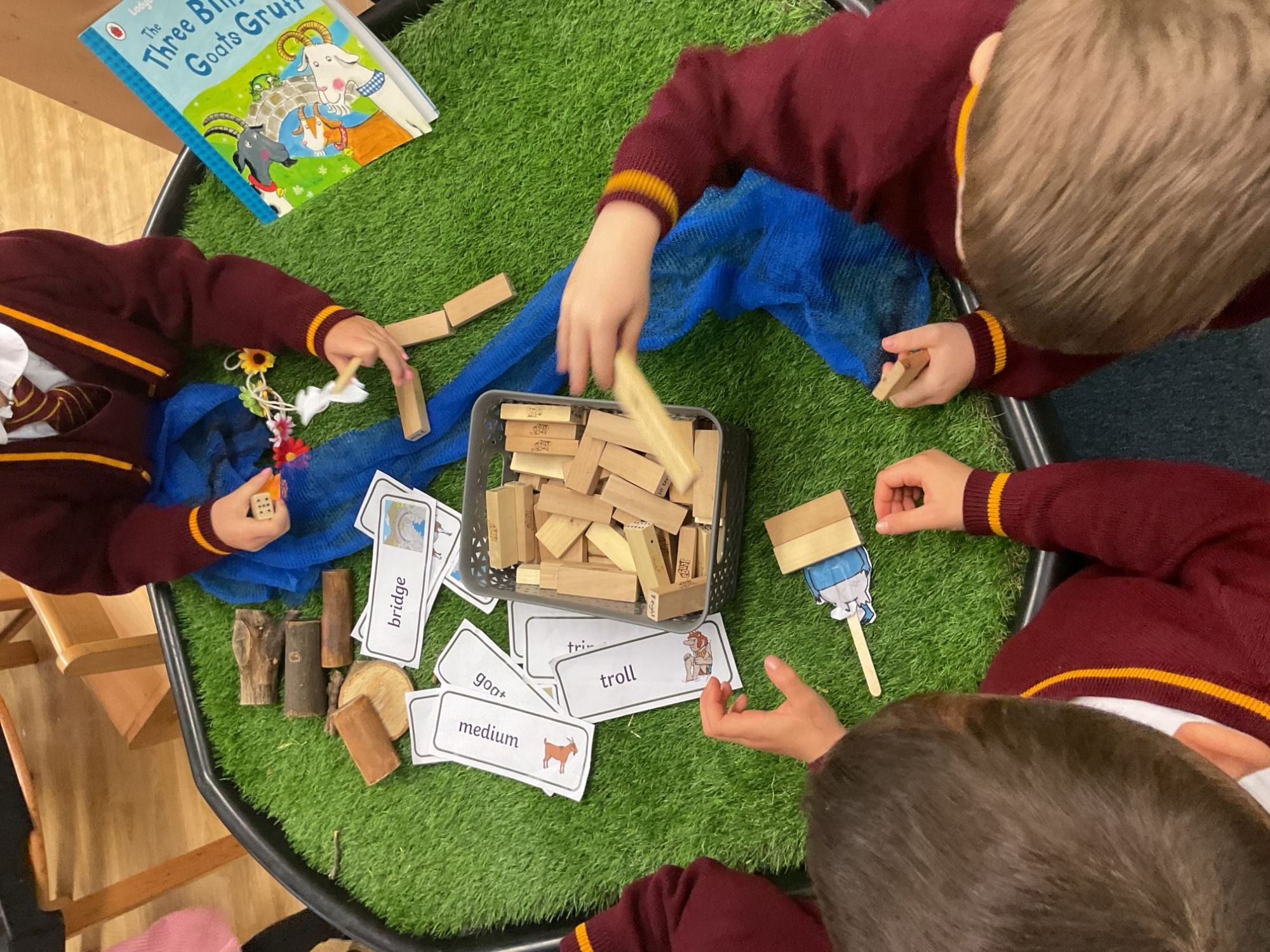Children had lots of opportunities to explore The Three Billy Goats Gruff through tuff tray activities, fine motor tasks, mud painting, and building bridges, supporting their creativity, problem-solving, and storytelling skills.