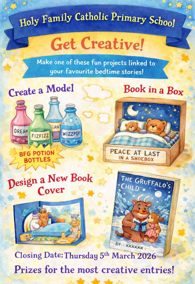 Reading - Reading is at the heart of all our learning at Holy Family. To support this at home, please could all children ensure that they read their school reading book every night and that the planner is signed by an adult. Alongside this, it is also key that all children select their own reading for pleasure book which they will also have opportunities to read and share with others in school.