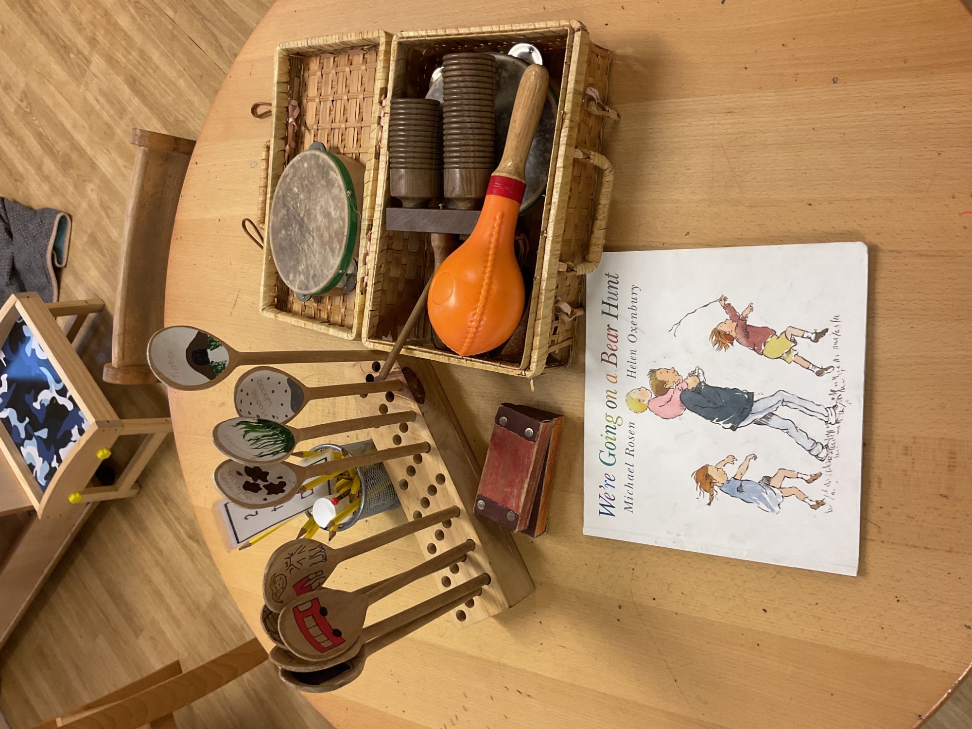 Reception children followed instructions to move to music and the story, 'The Teddy Bears Picnic'. They used actions to tell the story of 'The Sleeping Princess' before singing and performing a song based on the story. Children also played instruments to a section of 'Were Going on a Bear Hunt' and finally presented their musical story to Nursery children.