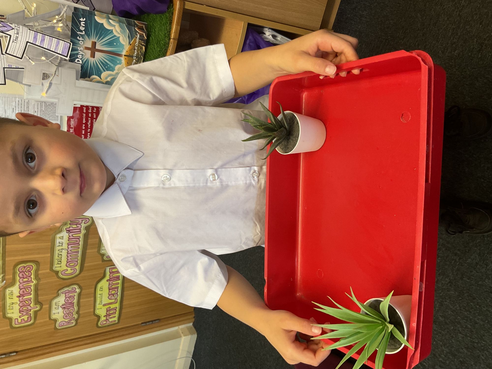 Children in Reception reverently joined in our Ash Wednesday liturgy, listening carefully to the Word of God before respectfully receiving the sign of the cross in ashes on their foreheads. They then explored the meaning of the wilderness by creating their own desert gardens, discussing how a barren place can feel empty and quiet, and learning that Lent is a special time to grow in love, kindness and thoughtful choices towards others.