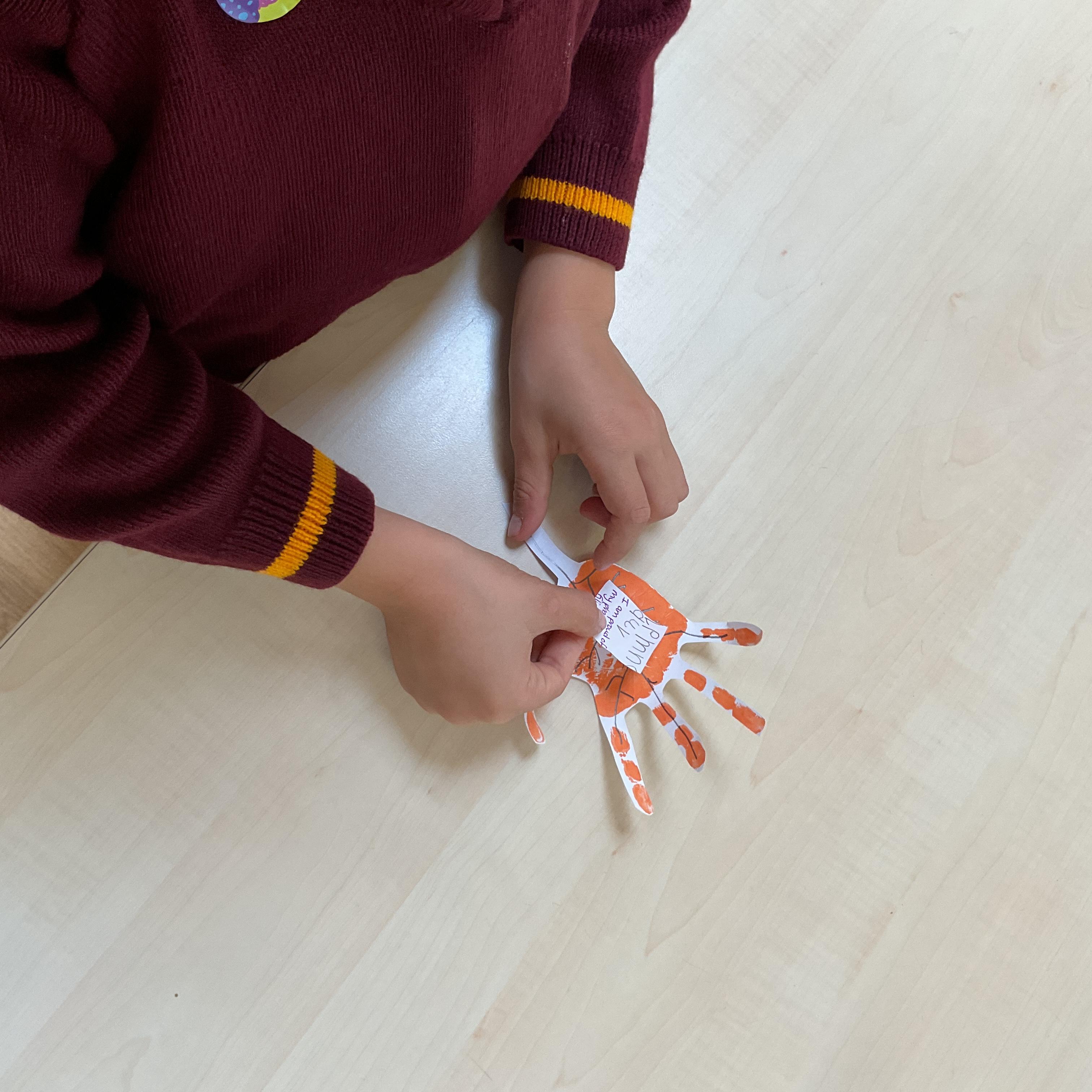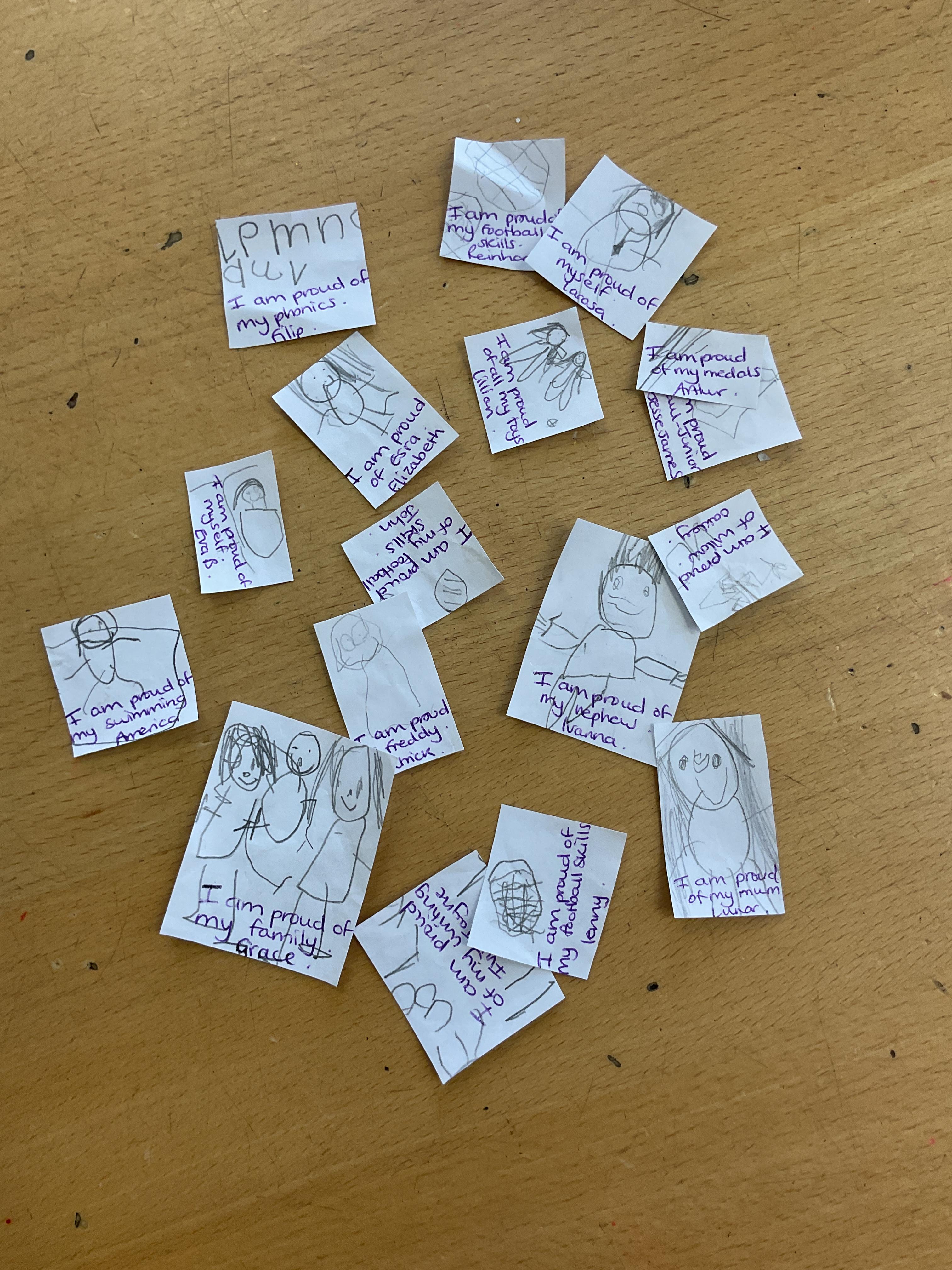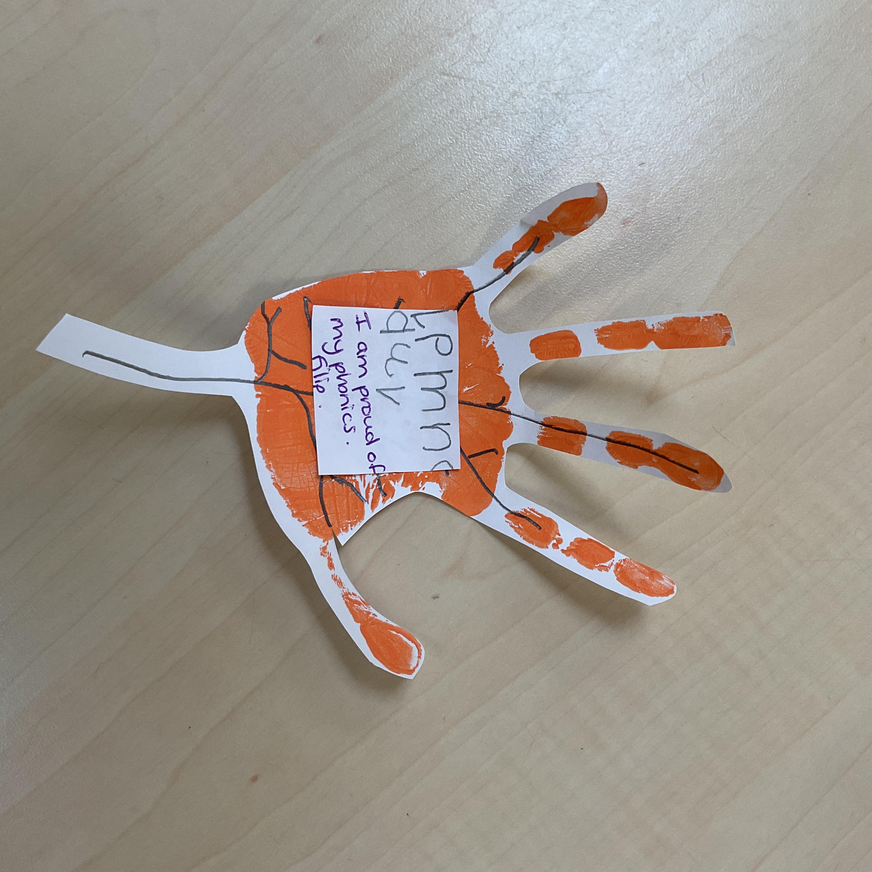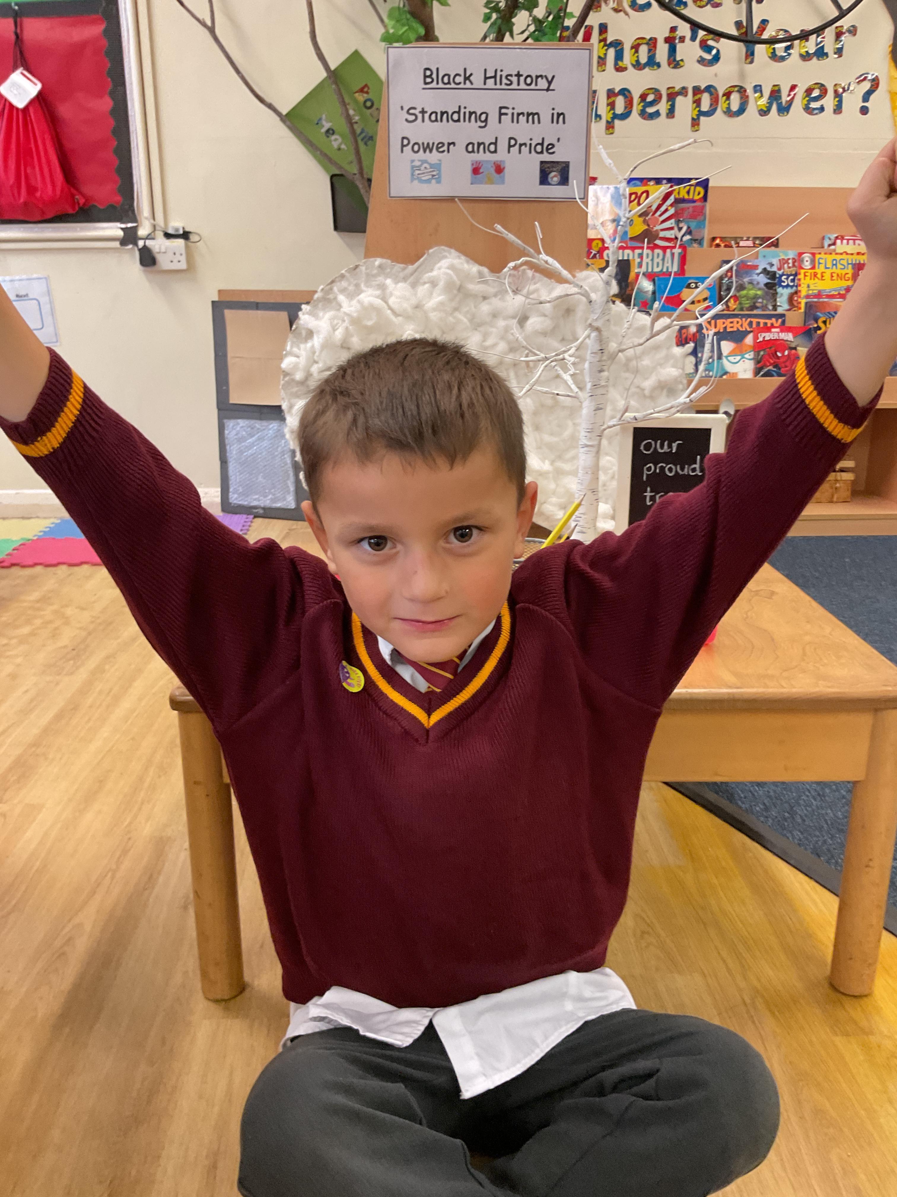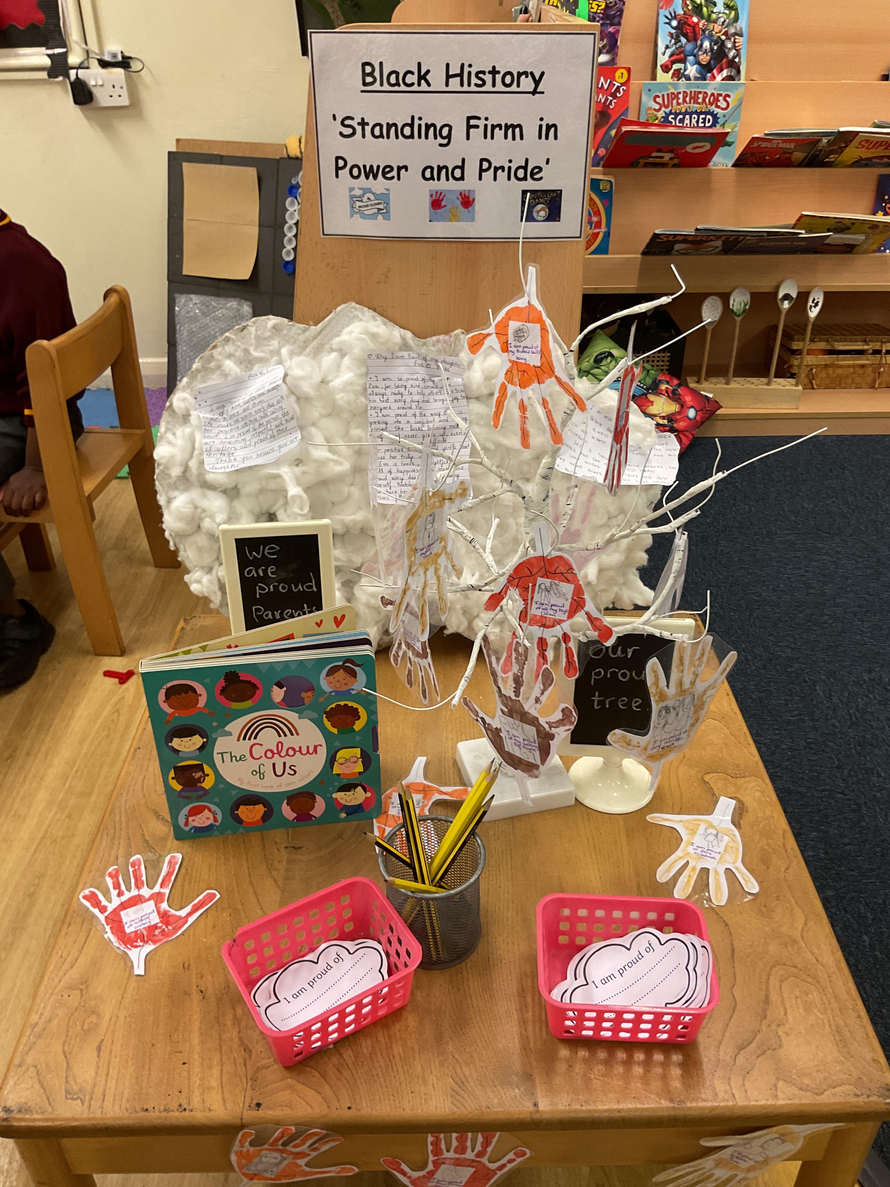 We read Giraffes Can't Dance to explore the themes of achievement and self-pride. The children created leaf handprints for our 'Proud Tree', each child adding a sentence or picture to show something they are proud of. Parents were invited to send in a short note expressing what makes them proud of their child. These were shared during circle time and displayed as part of our Black History Week Display.