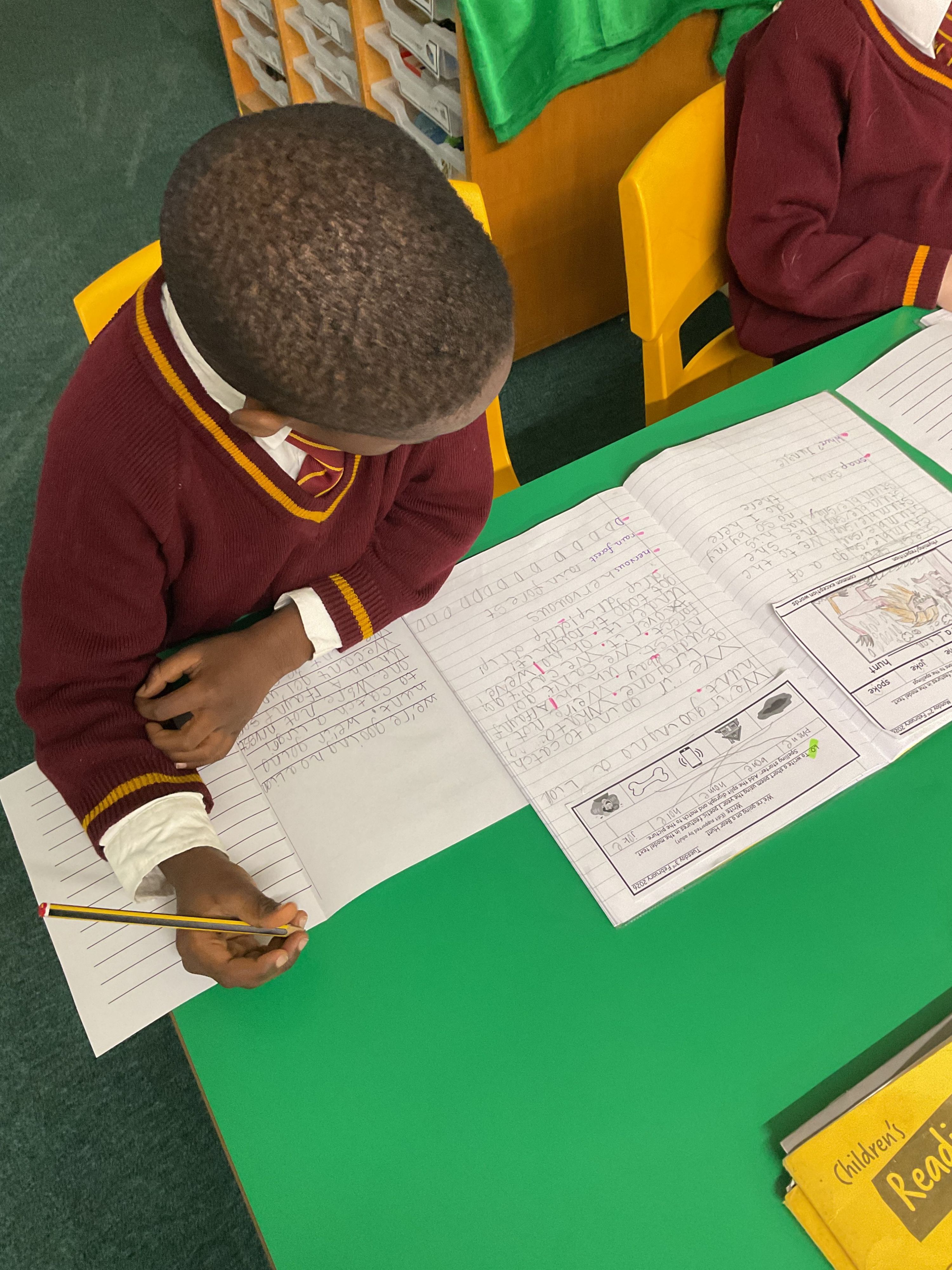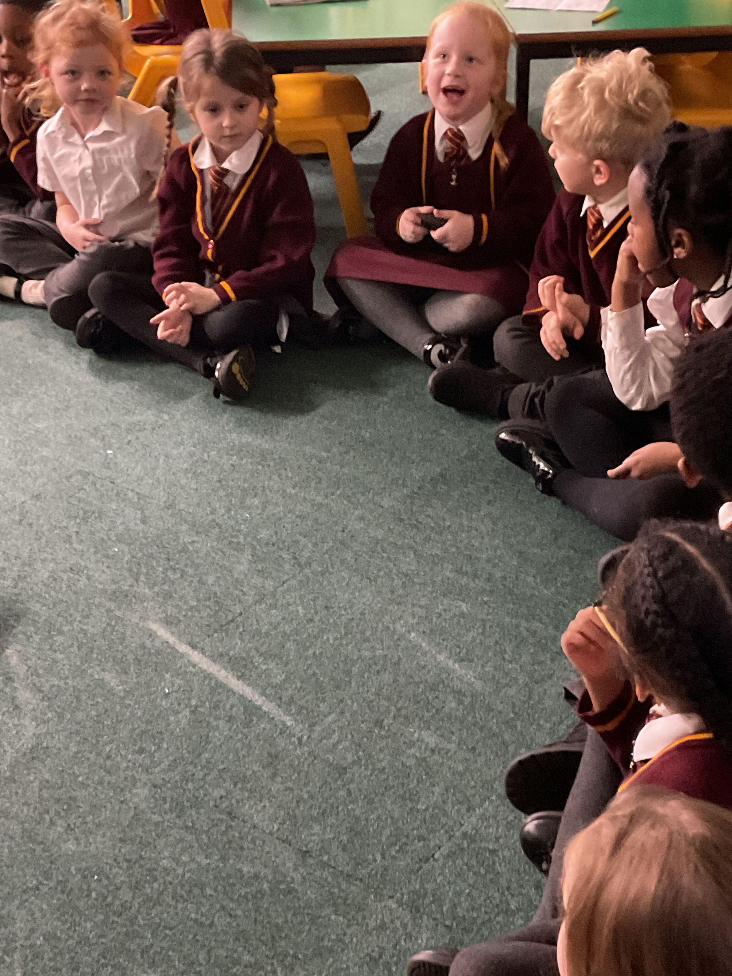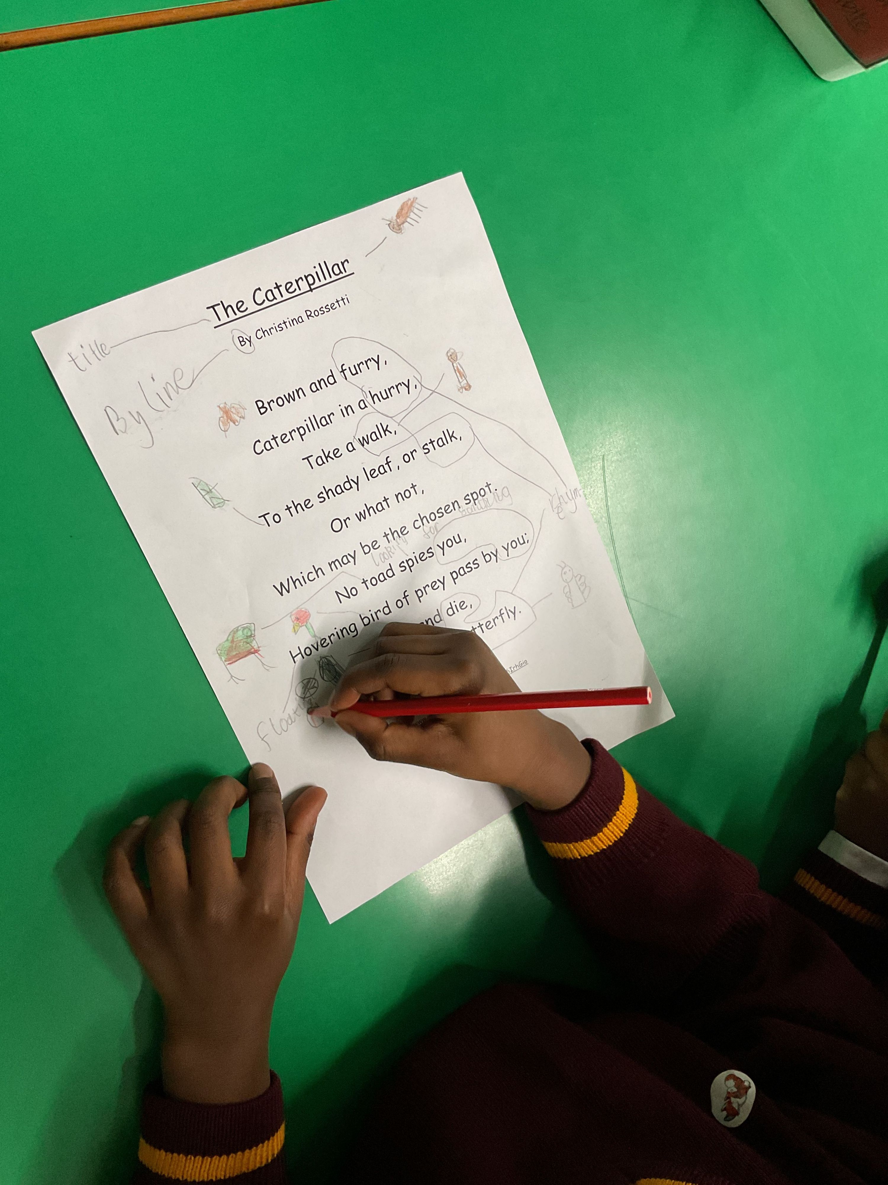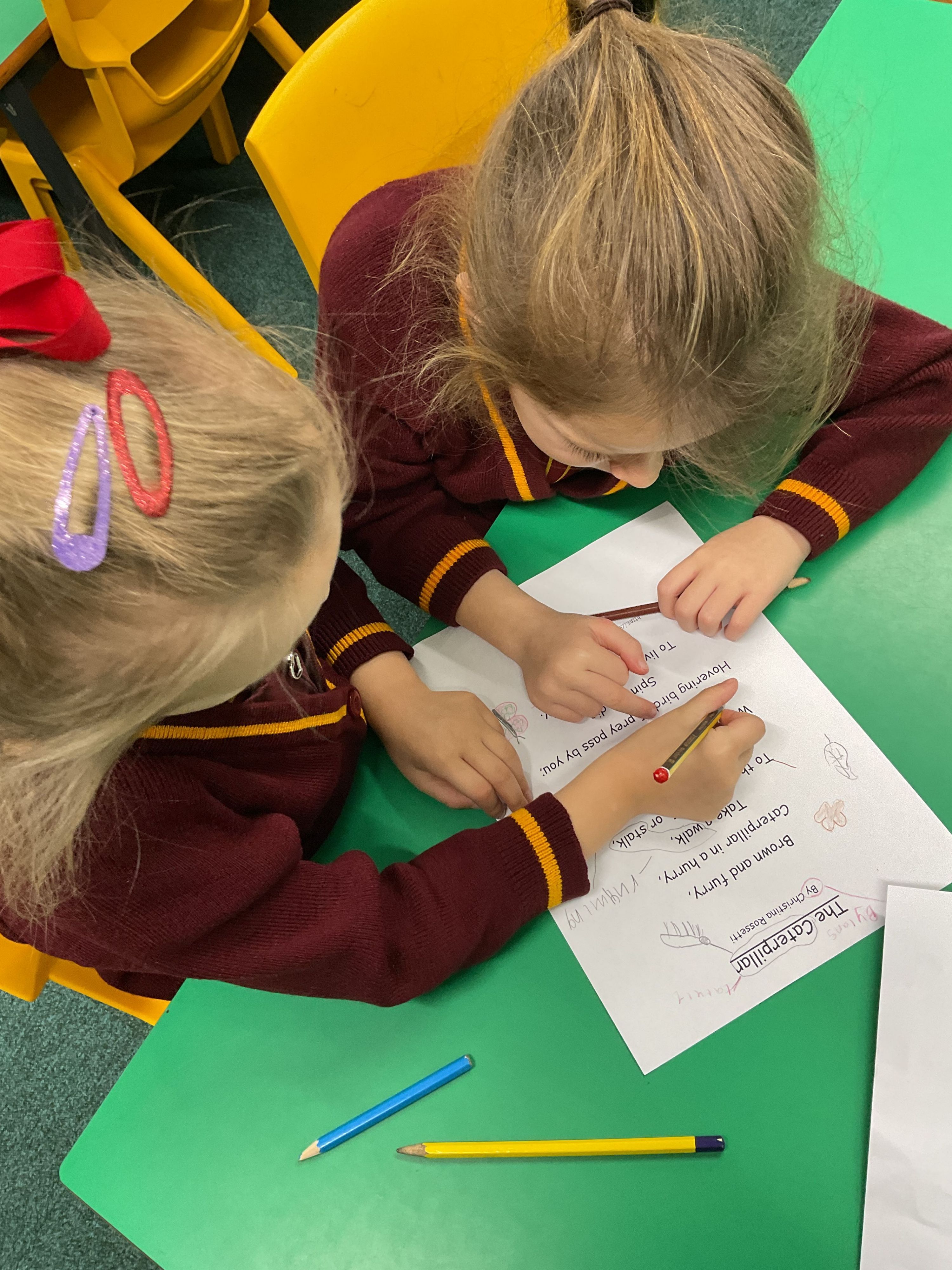 In teams, the children looked at the poem ‘The Caterpillar’ by Christina Rossetti. They read and discussed the poem. They looked at the words used and the shape of the writing. After the poem was read aloud by an adult, the children noticed and discuss the sounds of the words. We discussed rhyming words and how they have the same sound at the end.