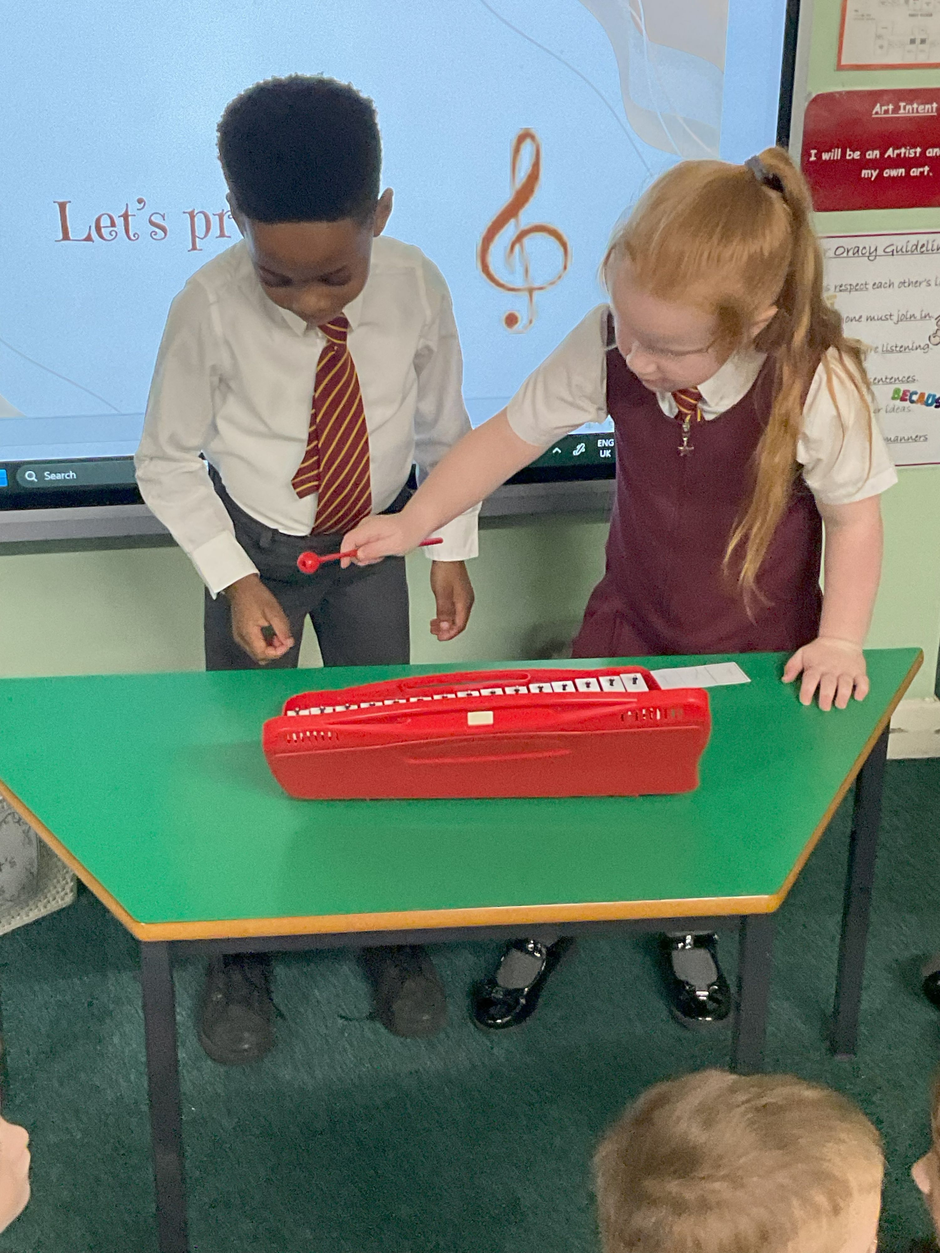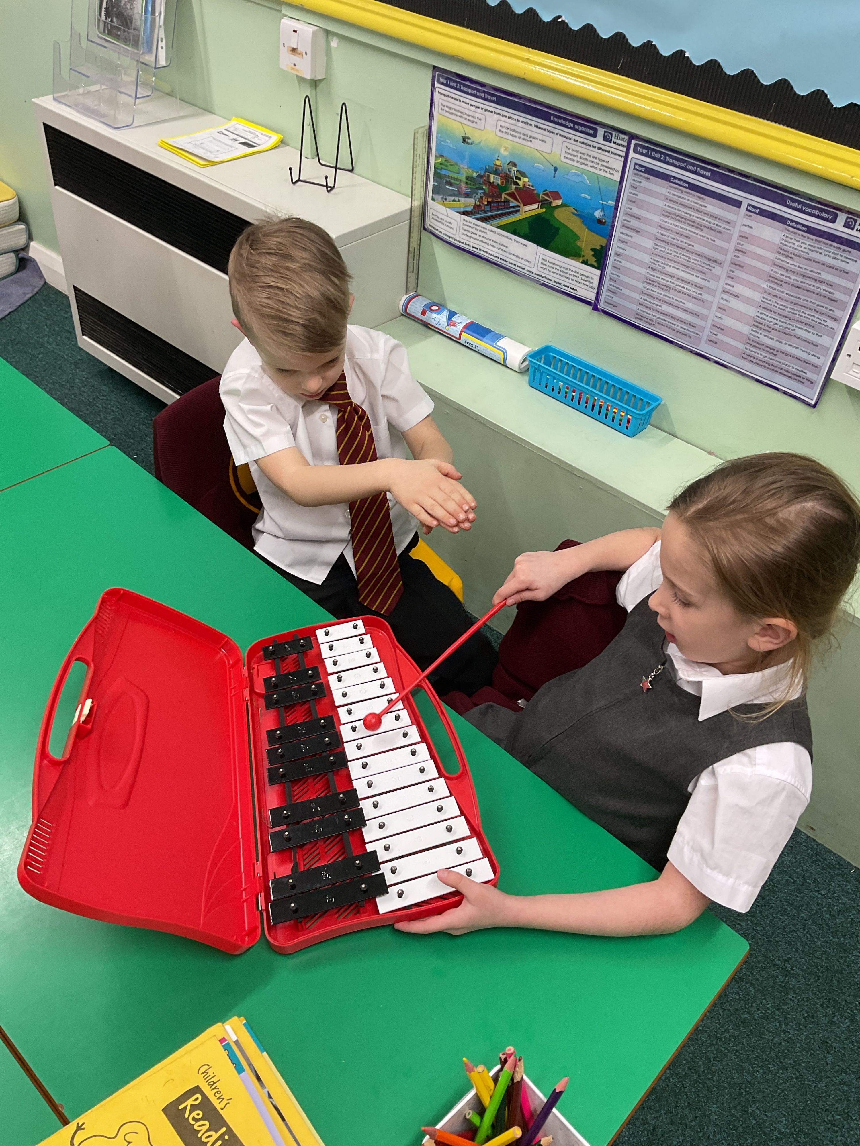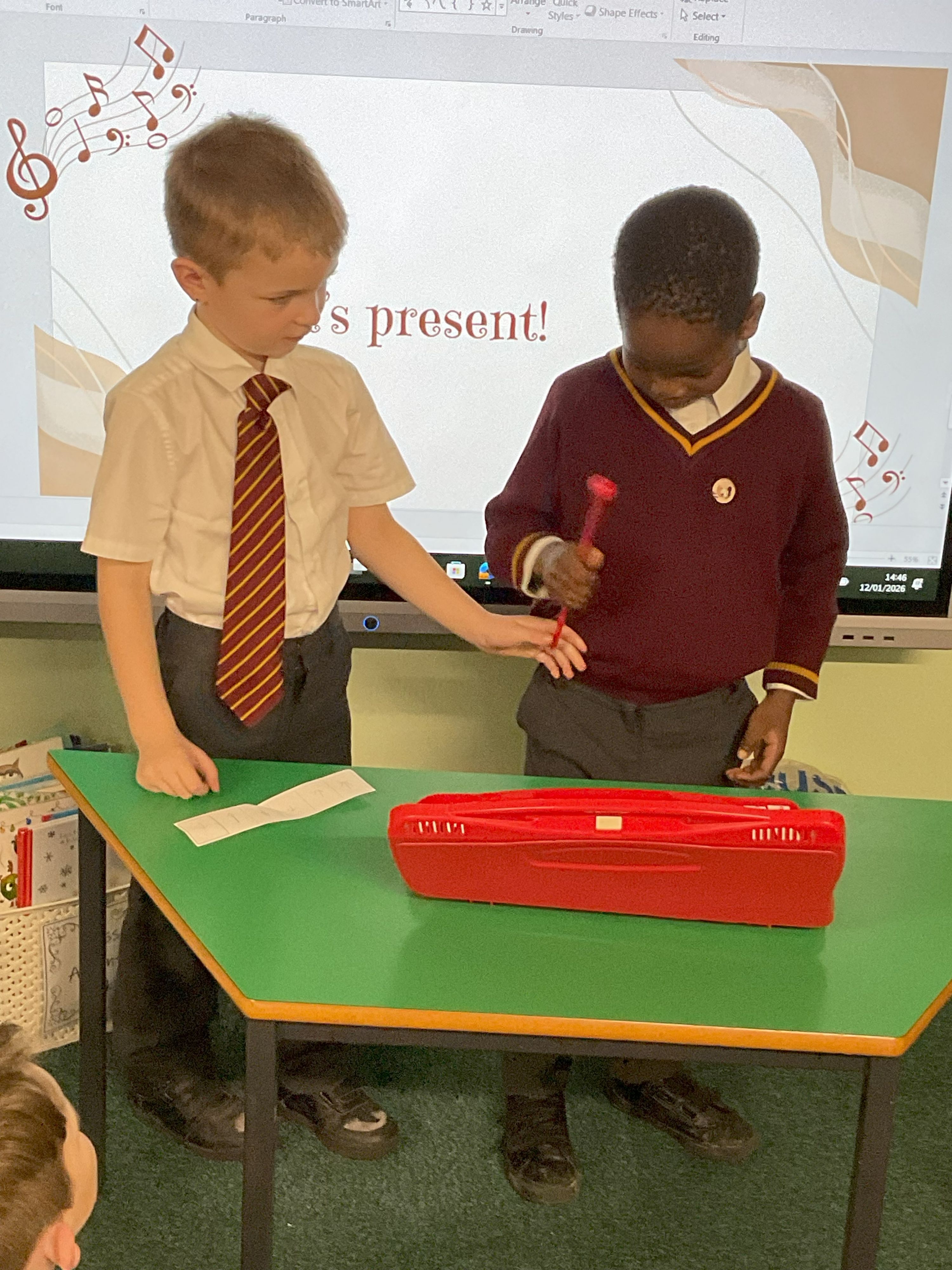 Year 1 loved creating and performing their own superhero theme tunes using patterns of high and low-pitched notes and creating rhythms.