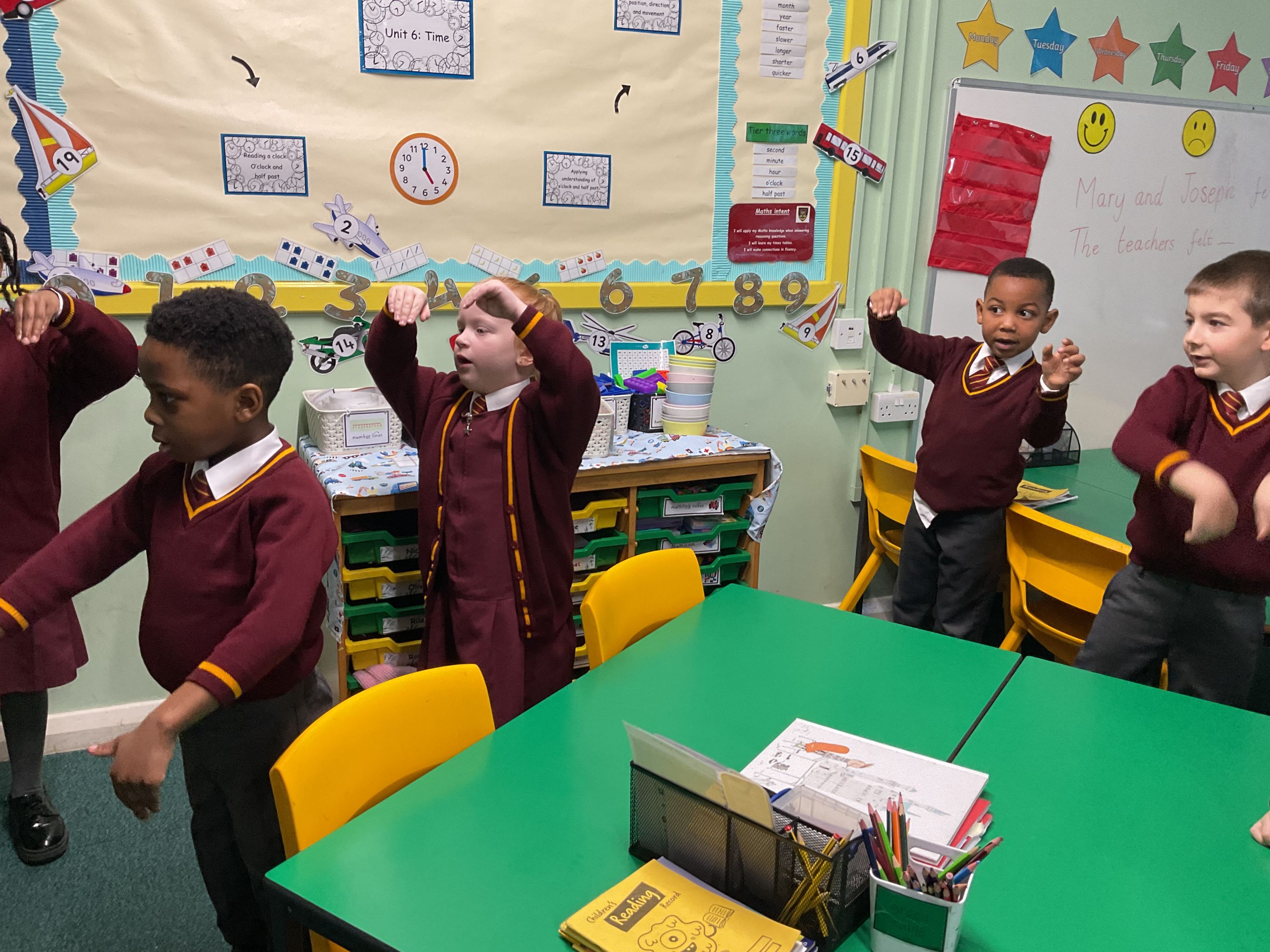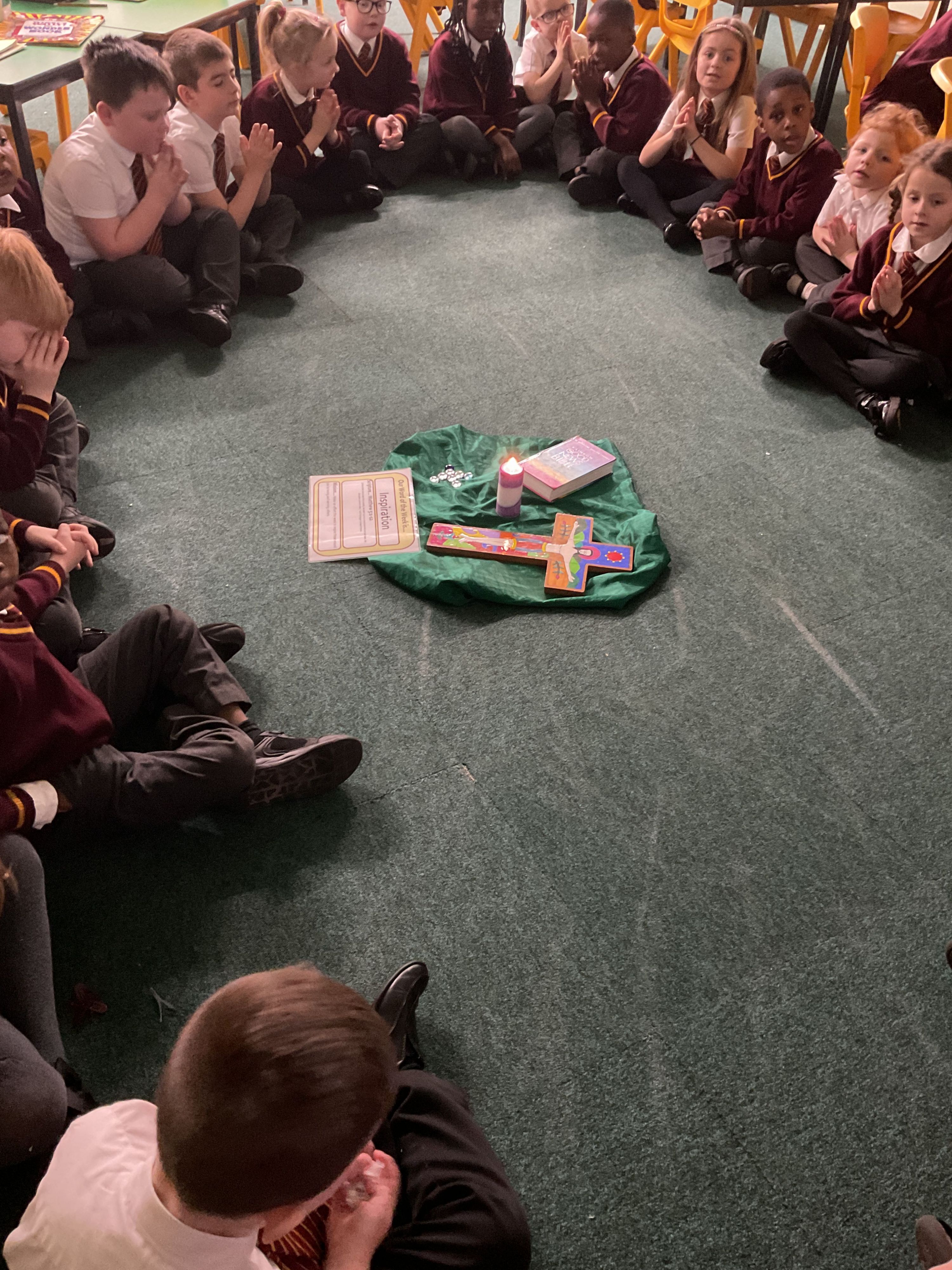 Year 1 took part in a Celebration of the Word linked to John 1:29–34 – John Testifies About Jesus, exploring the Word of the Week, Discipleship. The children completed a guided prayer with actions: “Holy Spirit (hands open), help me listen (hand to ear), help me love (hands on heart), help me follow Jesus (step forward).”