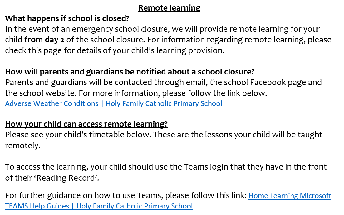 ►Reading - Reading is at the heart of all our learning at Holy Family. To support this at home, please could all children ensure that they read their school reading book every night and that the planner is signed by an adult. Children will need to bring their reading book and planner back to school each day.
