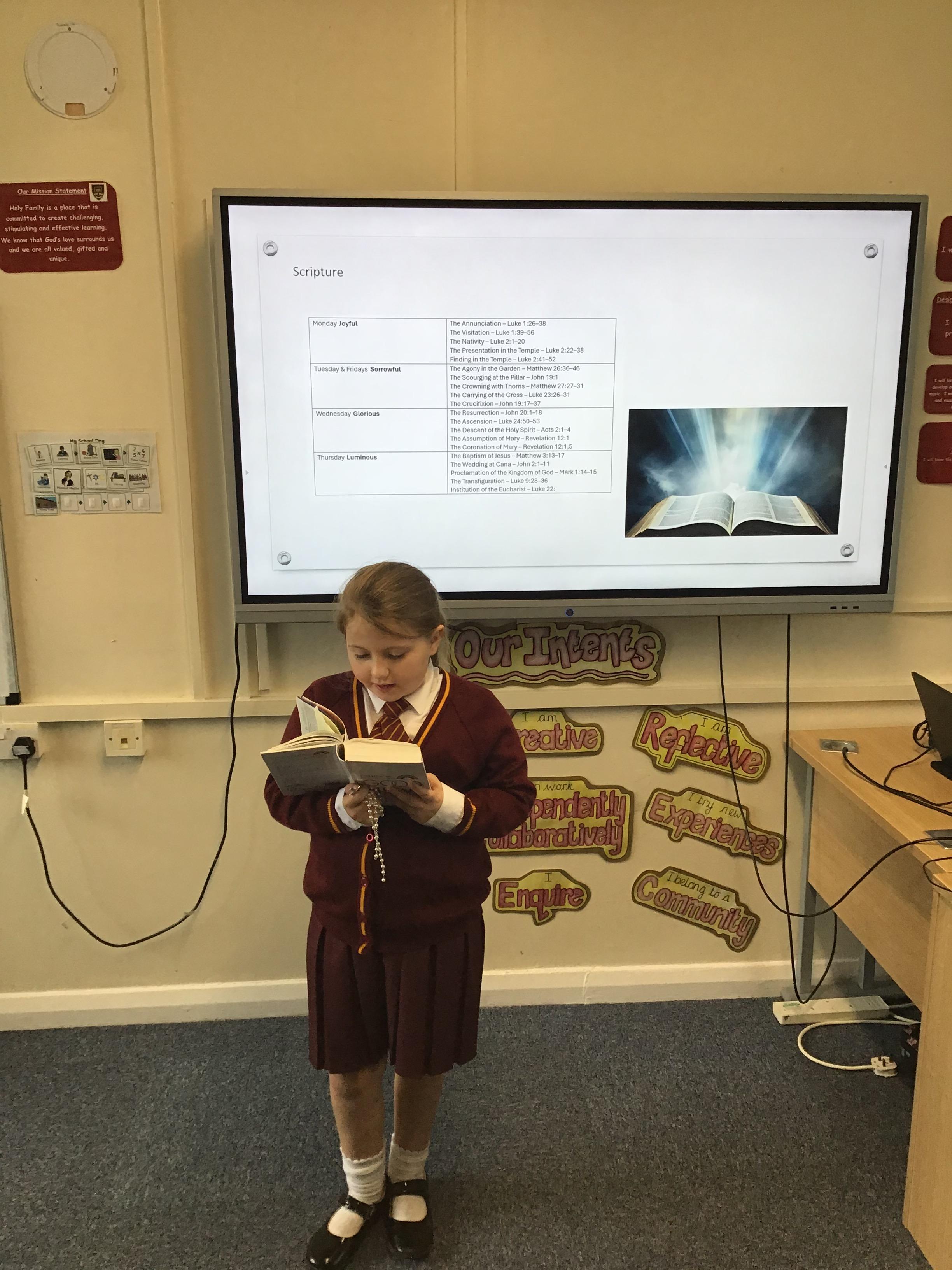 Throughout the month of October, our Year 4 children have been praying the Rosary each day with great reverence and joy. As they reflect on the Mysteries, they take turns selecting a special passage from the Bible to guide their prayer and deepen their understanding of Jesus and Mary. This daily devotion has helped the children grow in faith, peace, and love as they journey together through this holy month.