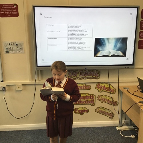 Children plan and deliver a class 'Celebration of the Word' three times a week. It is planned around the Gospel reading they hear on Monday, which links to the word of the week.