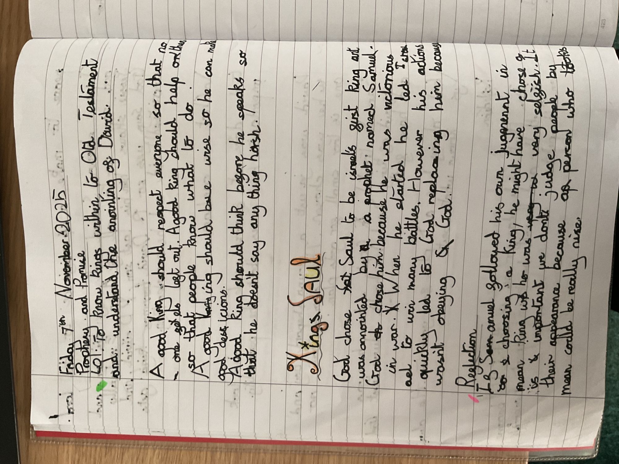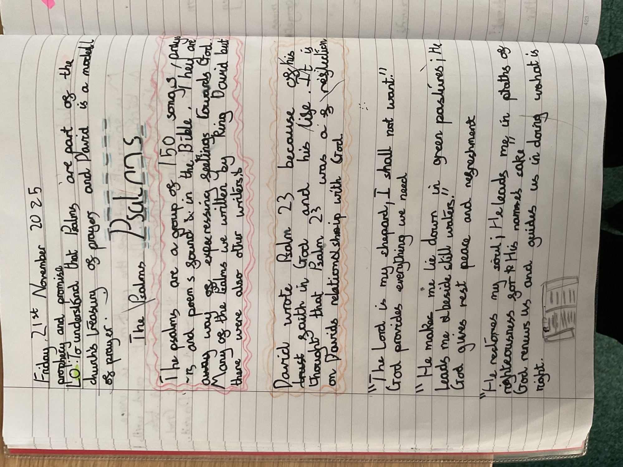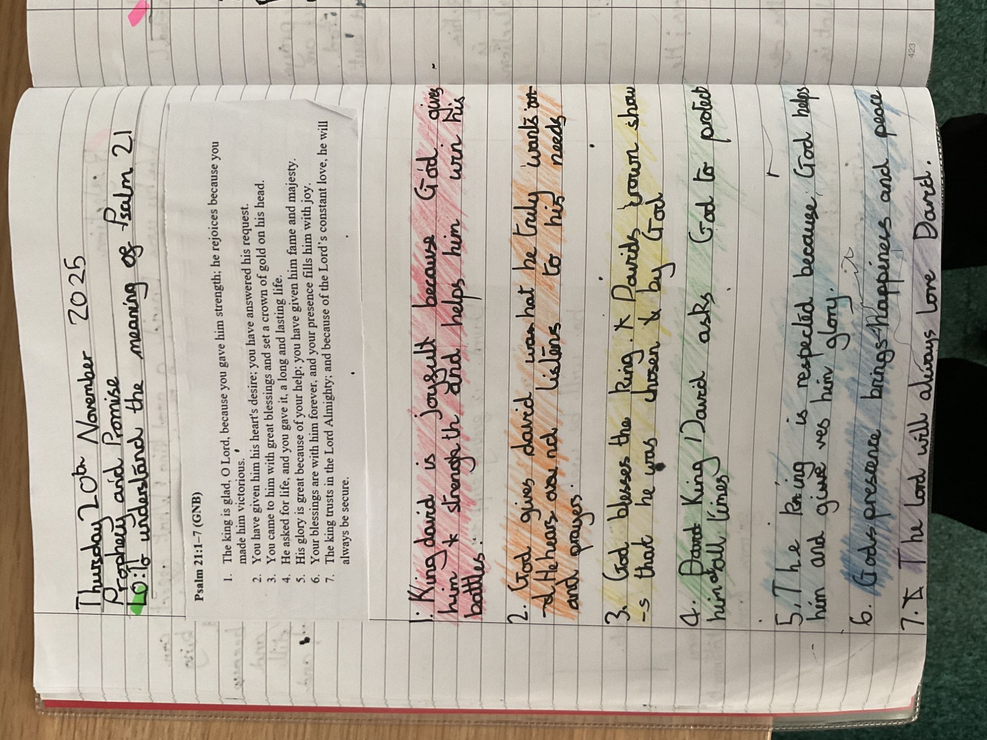 Year 5 analysed scripture from the Old Testament including psalms; we looked at King David's life and his devotion to Jesus in detail