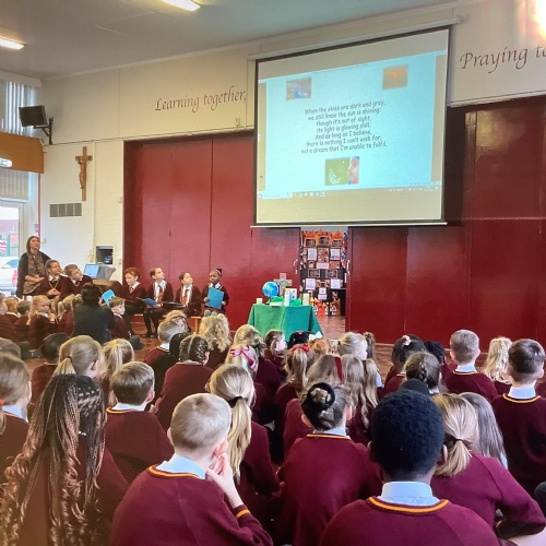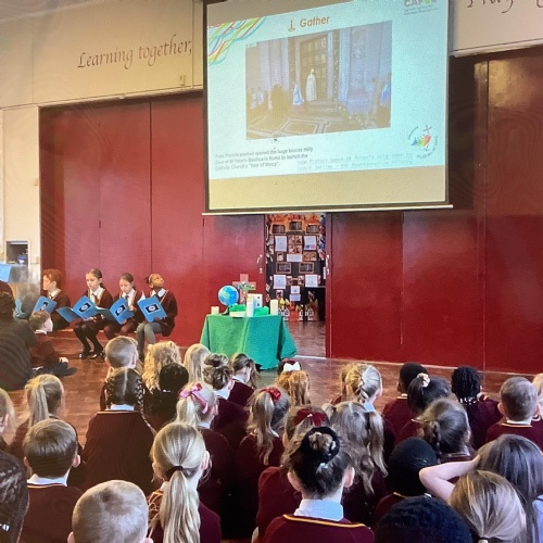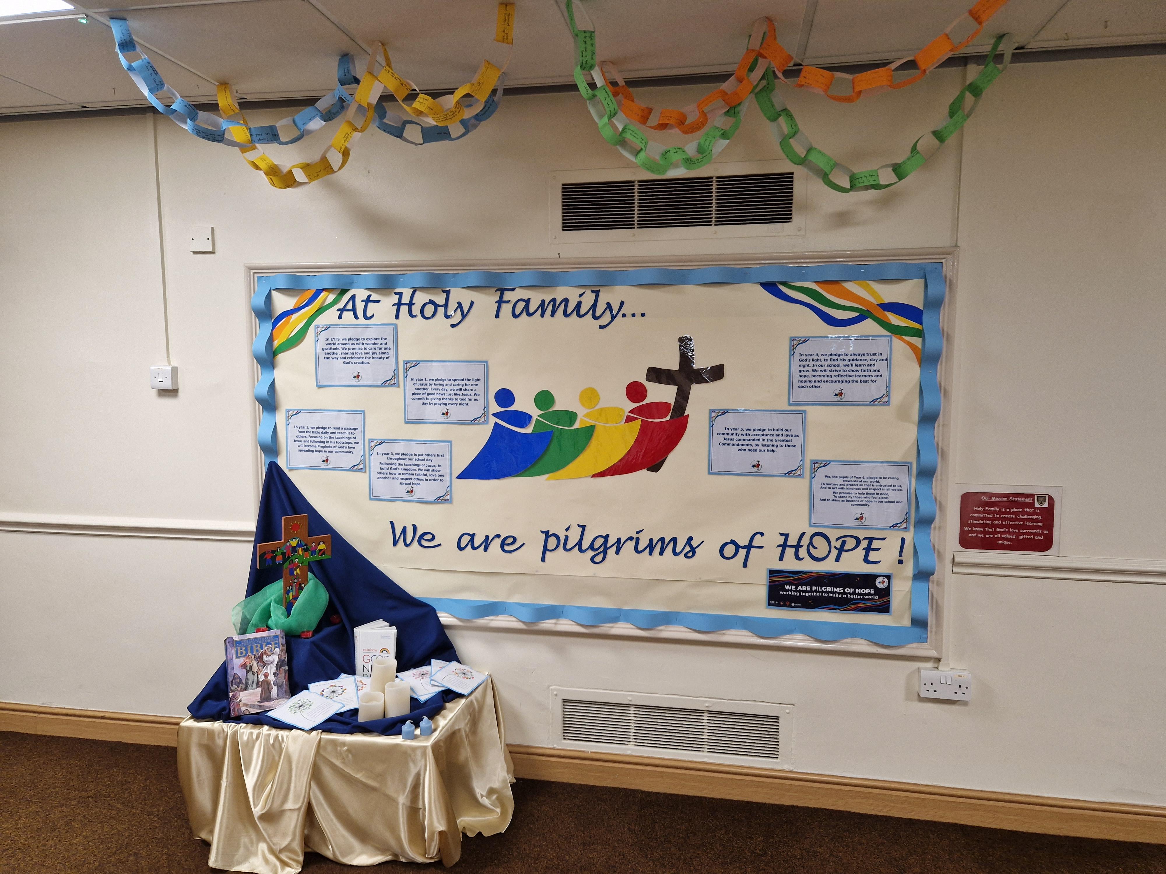 To start our Jubilee celebrations at Holy Family, the Chaplaincy Team created a beautiful focal point for our assembly taking inspiration from the Pope of spreading hope around the world.